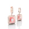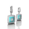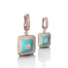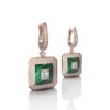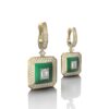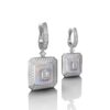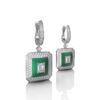 The design showcases square-shaped pendants, each centered with a natural, emerald-cut diamond. The diamonds are set against vibrant ceramic inlays, framed by a halo of smaller diamonds for brilliance and depth, while pavé-set diamonds also illuminate the hoop.