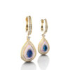 Each earring features a pear-shaped pendant, highlighted by a natural, pear-cut sapphire that radiates deep blue brilliance. The gemstone rests on a delicate mother of pearl inlay, creating a refined contrast, while a halo of natural diamonds adds sparkle and sophistication. Additional pavé-set diamonds adorn the hoop for an elegant finishing touch.