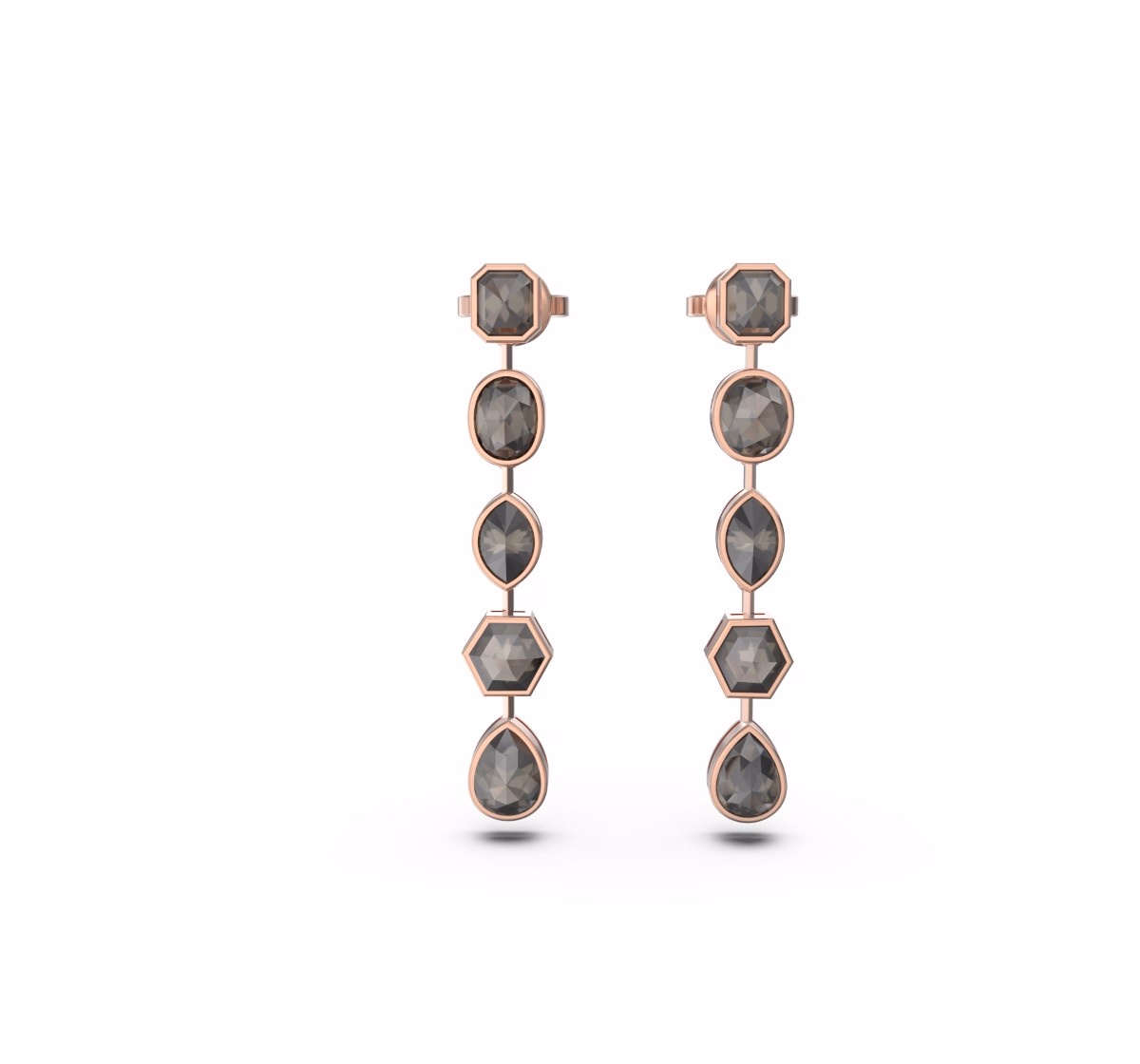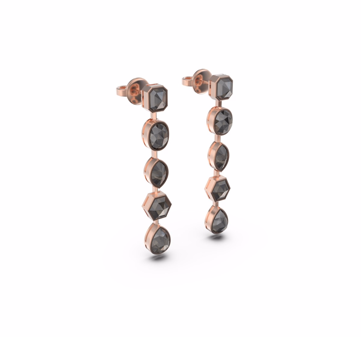 A vertical composition of rough diamonds totaling 8.75 carats unfolds in a rhythmic sequence of organic forms — round, hexagonal, and pear-shaped silhouettes creating a sculptural flow of light and texture.