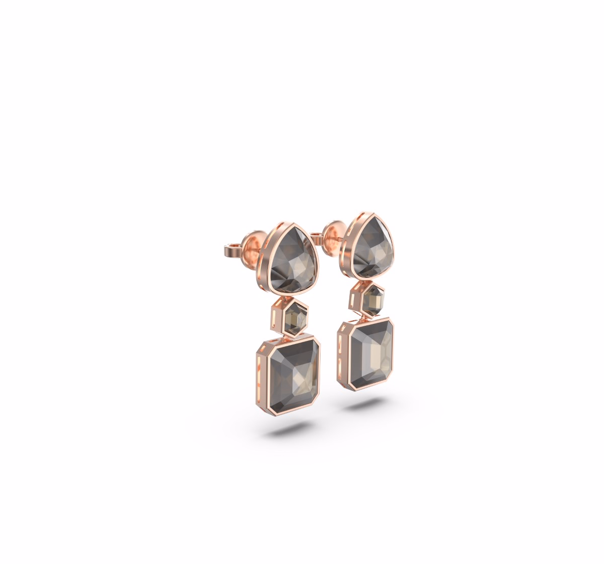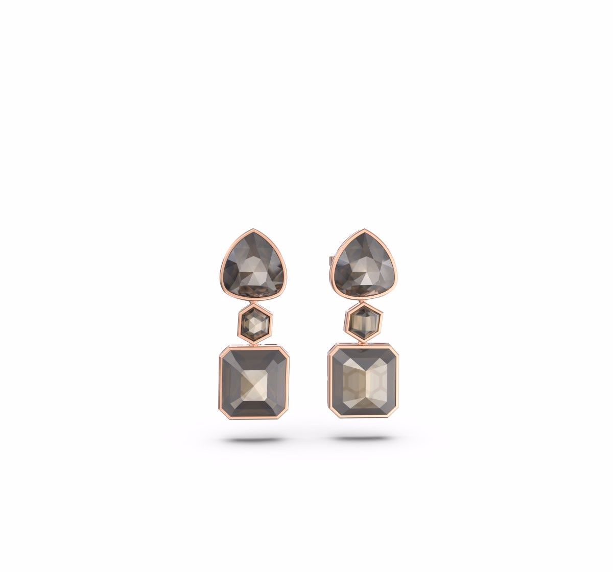 The composition unfolds in geometric harmony: a bold pear, a sculptural hexagon, and a grounded emerald cut, all brought together in a fluid vertical balance.