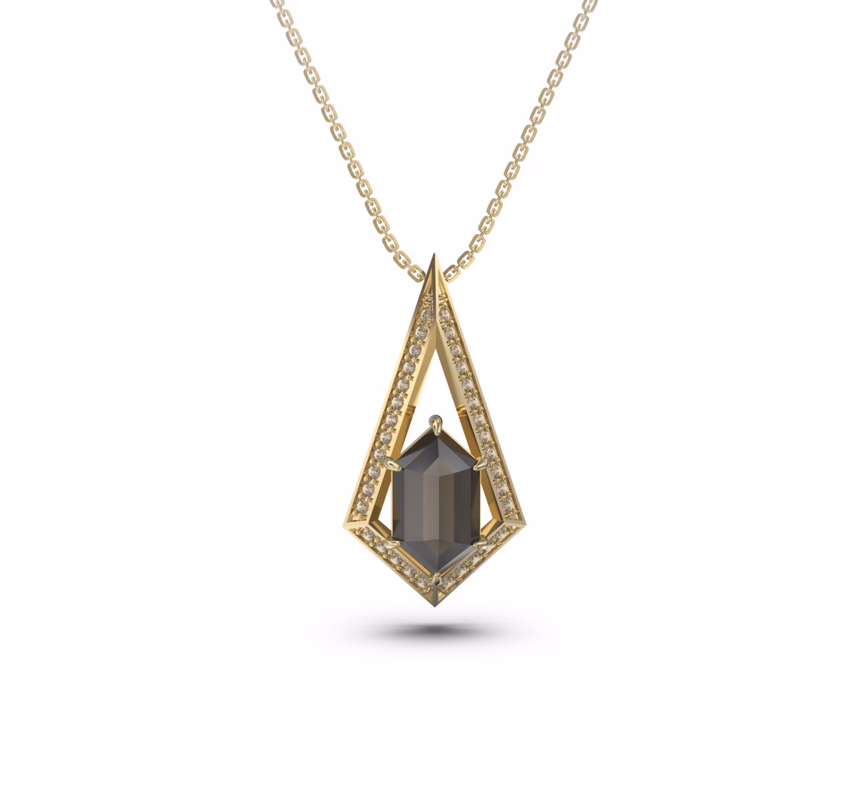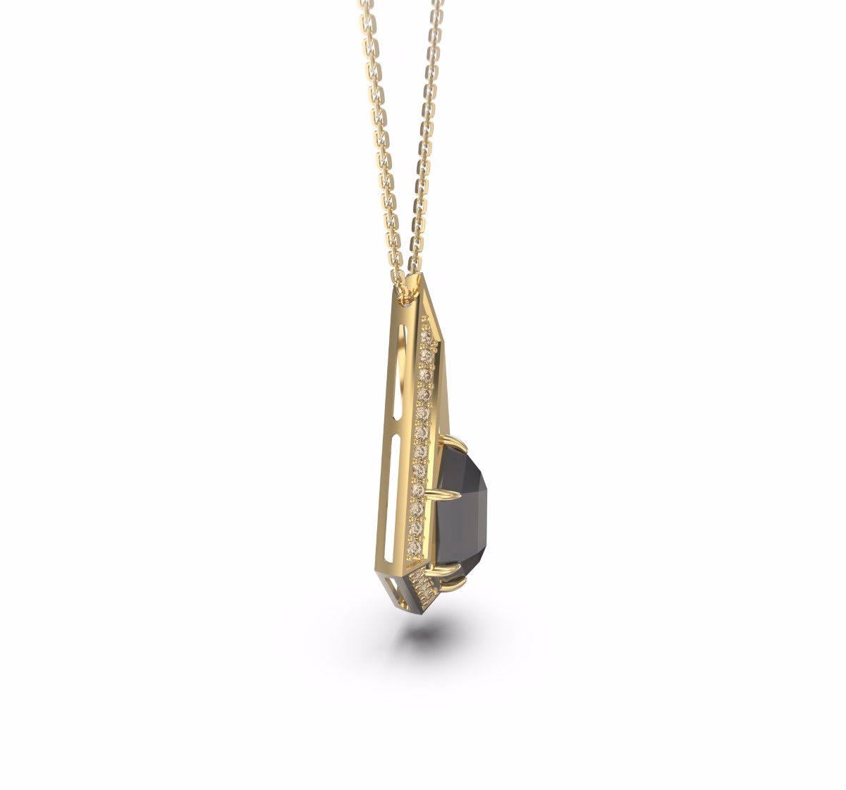 This architectural pendant reveals the raw charisma of nature through a rough diamond weighing 2.02 carats, embraced by a frame of brown diamonds (0.57 carats) that add a subtle warmth and glow. Its elongated geometric silhouette symbolizes the harmony between precision and imperfection — the essence of Rustoria’s philosophy.
