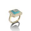 The design showcases a square-shaped centerpiece, featuring a natural, princess-cut diamond at its core. Set against a backdrop of colored ceramic inlays, the diamond radiates brilliance, framed by a halo of smaller diamonds that add depth and sparkle.