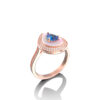 The design features a pear-shaped centerpiece, highlighted by a natural, pear-cut sapphire that radiates vivid blue brilliance. The gemstone rests on a delicate mother of pearl inlay, creating a refined contrast, while a halo of natural diamonds enhances the sparkle. Additional pavé-set diamonds extend along the band, completing the look with sophisticated brilliance.