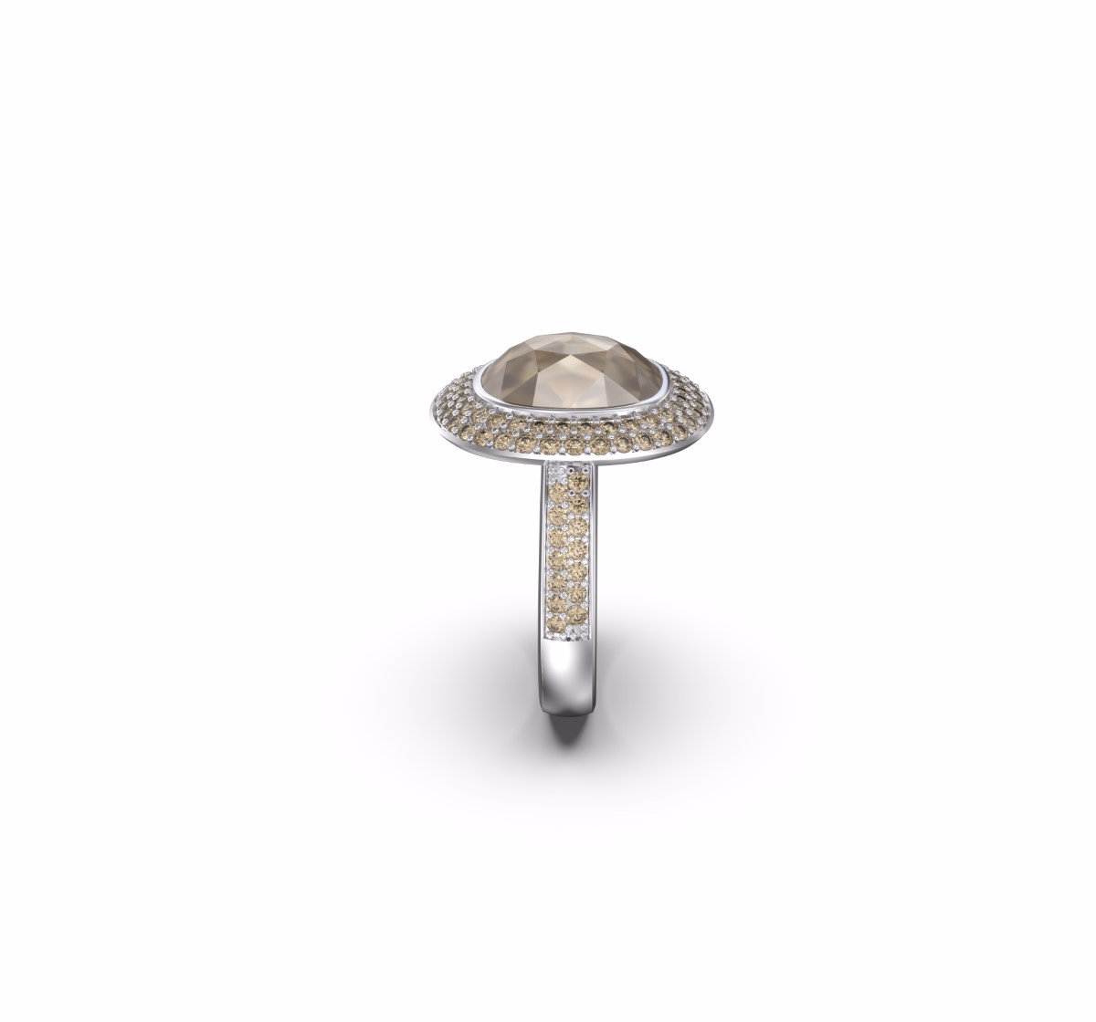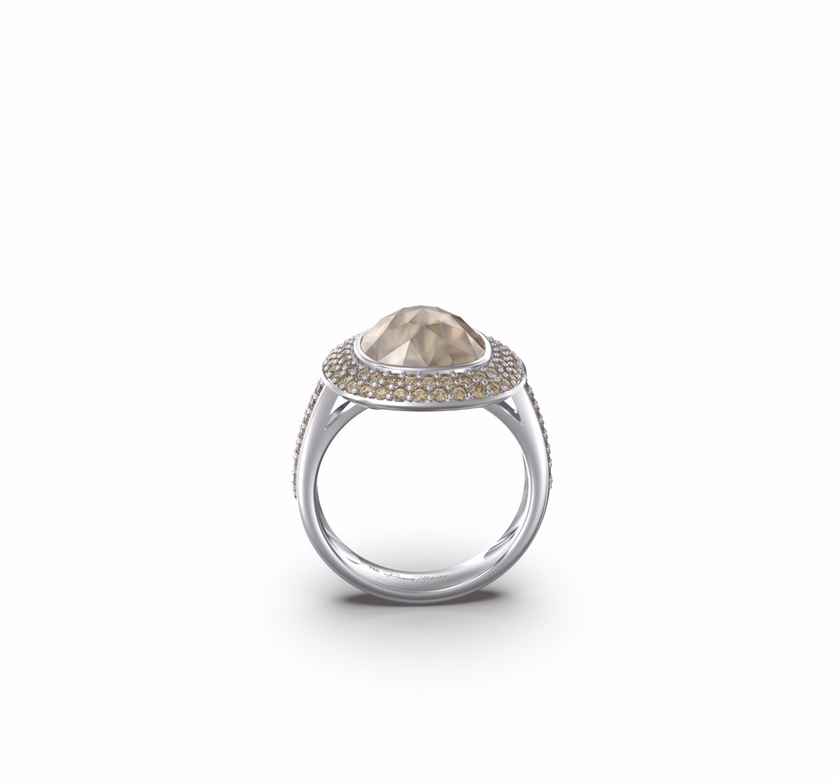 This sculptural ring embodies the pure power of nature refined into wearable art. At its heart lies a rough diamond weighing 3.43 carats, whose untouched facets reflect the essence of authenticity. Surrounding it, a halo of brown diamonds (0.65 carats) adds warmth and brilliance, enhancing the contrast between the wild and the exquisite.
