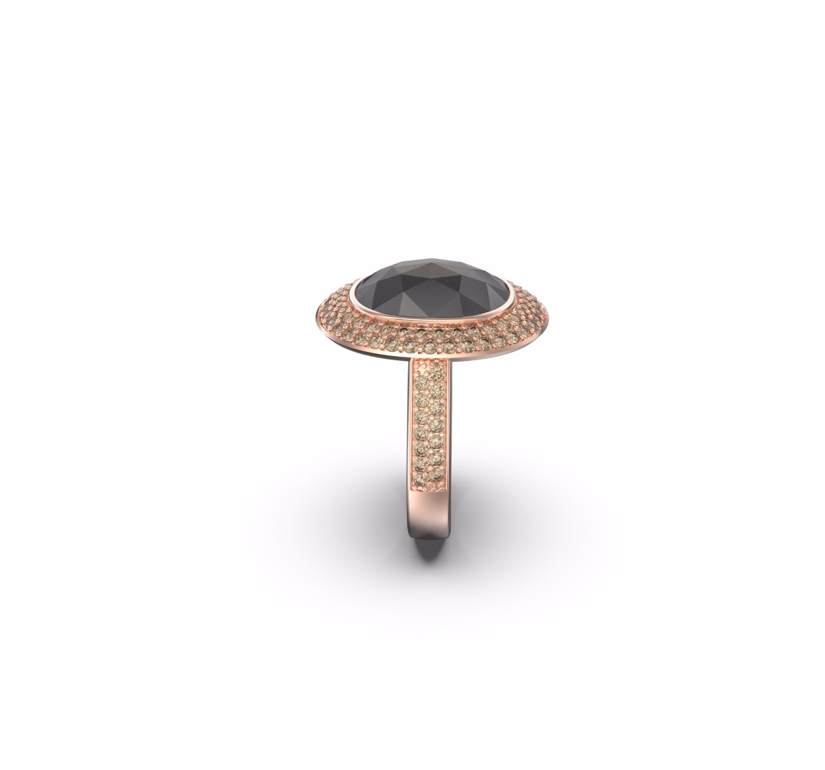 At its center lies a rough diamond weighing 3.58 carats, its untamed surface alive with organic brilliance. A surrounding halo of brown diamonds (0.70 carats) enhances the contrast between rugged natural texture and meticulous craftsmanship.