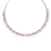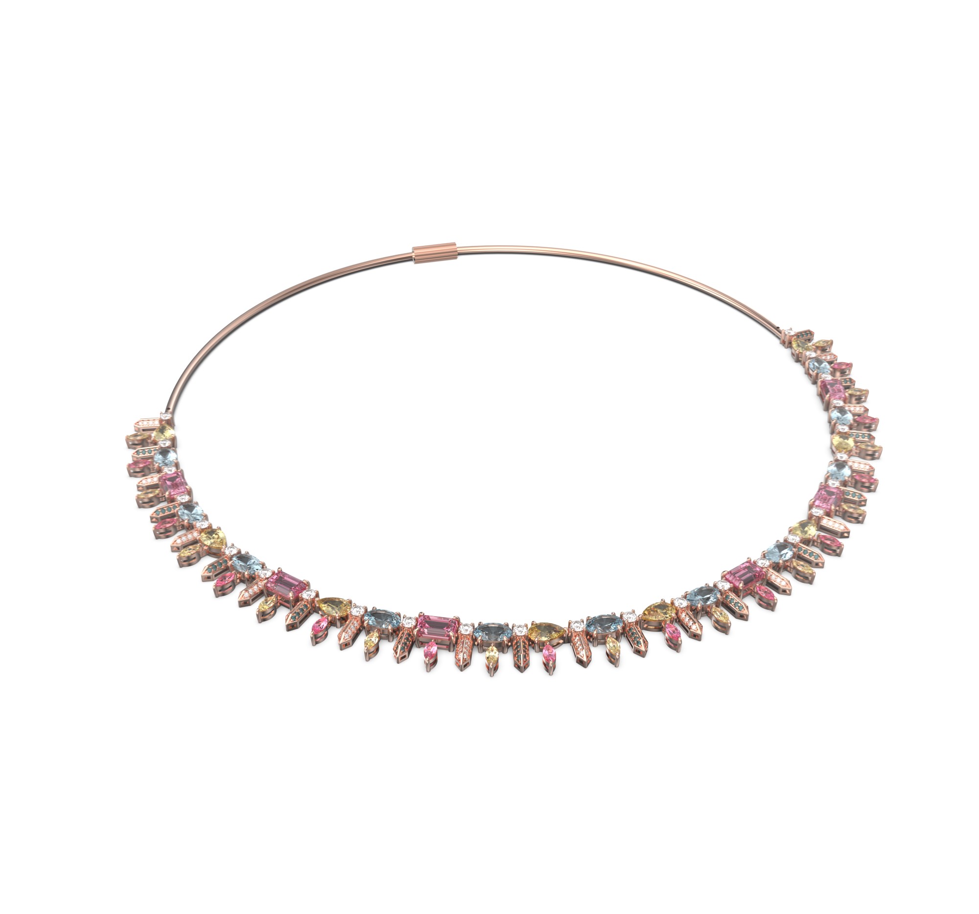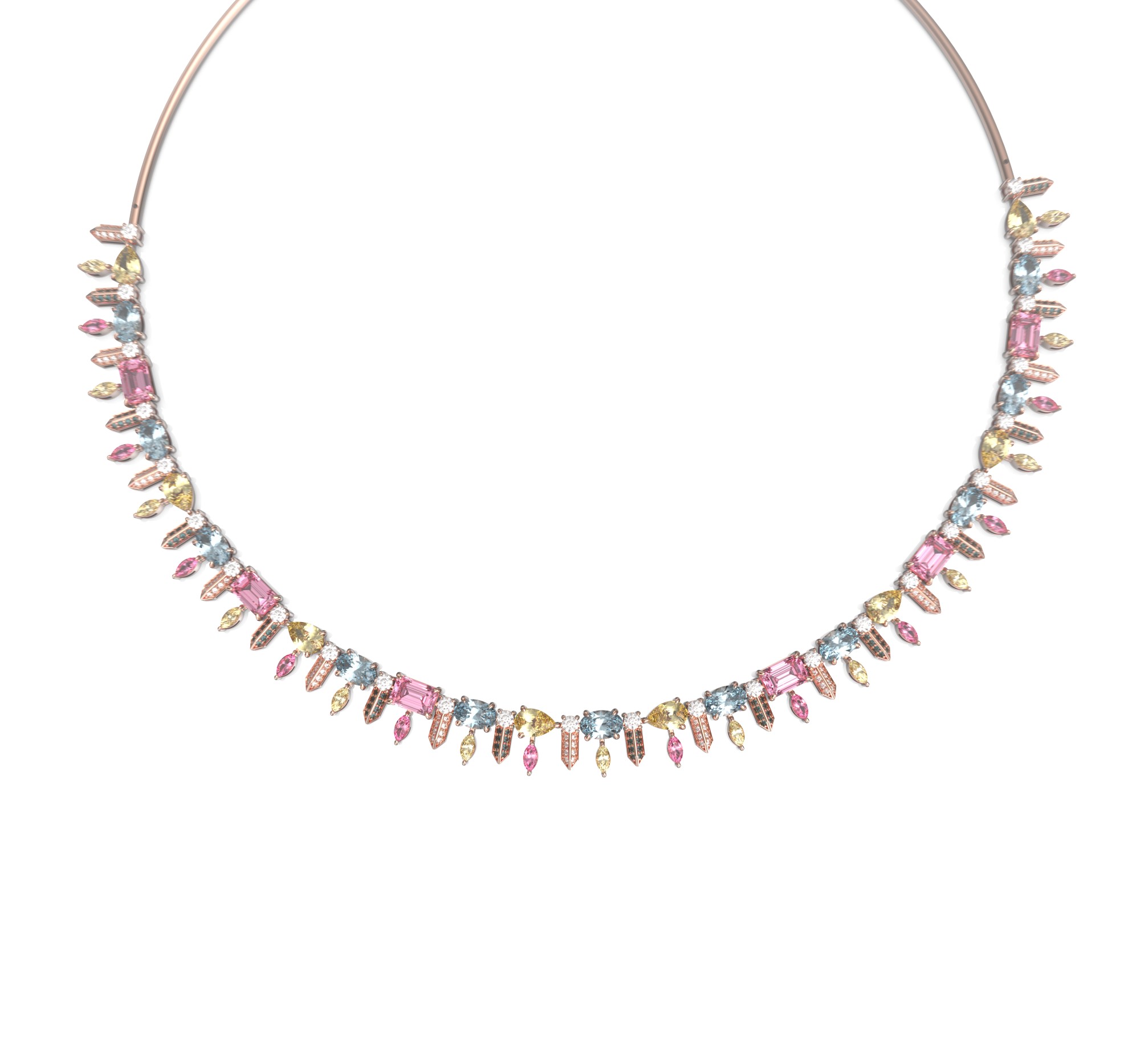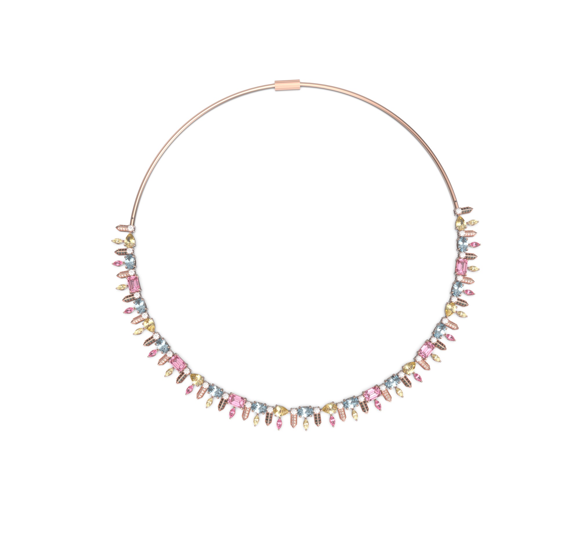 Expertly handcrafted from 18-karat rose gold, the choker is a bold reinterpretation of elegance. Its design features a stunning mosaic of multi-colored sapphires totaling 16.04 carats, gracefully complemented by 1.58 carats of natural diamonds. The gemstones are meticulously arranged to create a rhythmic play of light and color — from soft pinks to vivid blues and golden tones — symbolizing joyful sophistication and modern femininity.