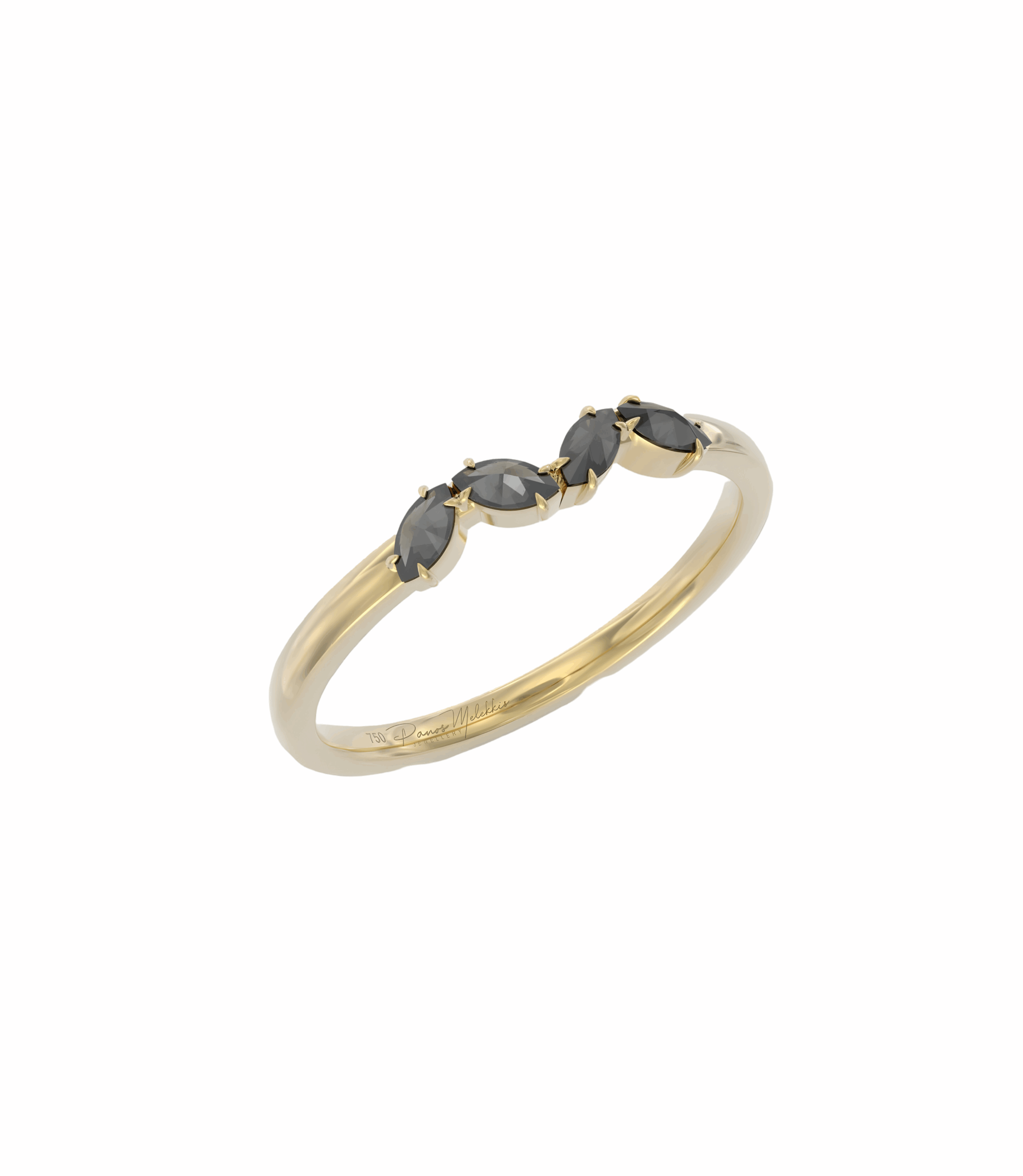 Crafted for the modern muse, this 18K gold ring radiates quiet strength and undeniable elegance. With a sleek band adorned with 0.13 carats of shimmering black diamonds, it merges sophistication with an edge, reflecting a confident, soulful spirit. This piece is designed for those who exude grace and poise while staying true to their authentic voice.