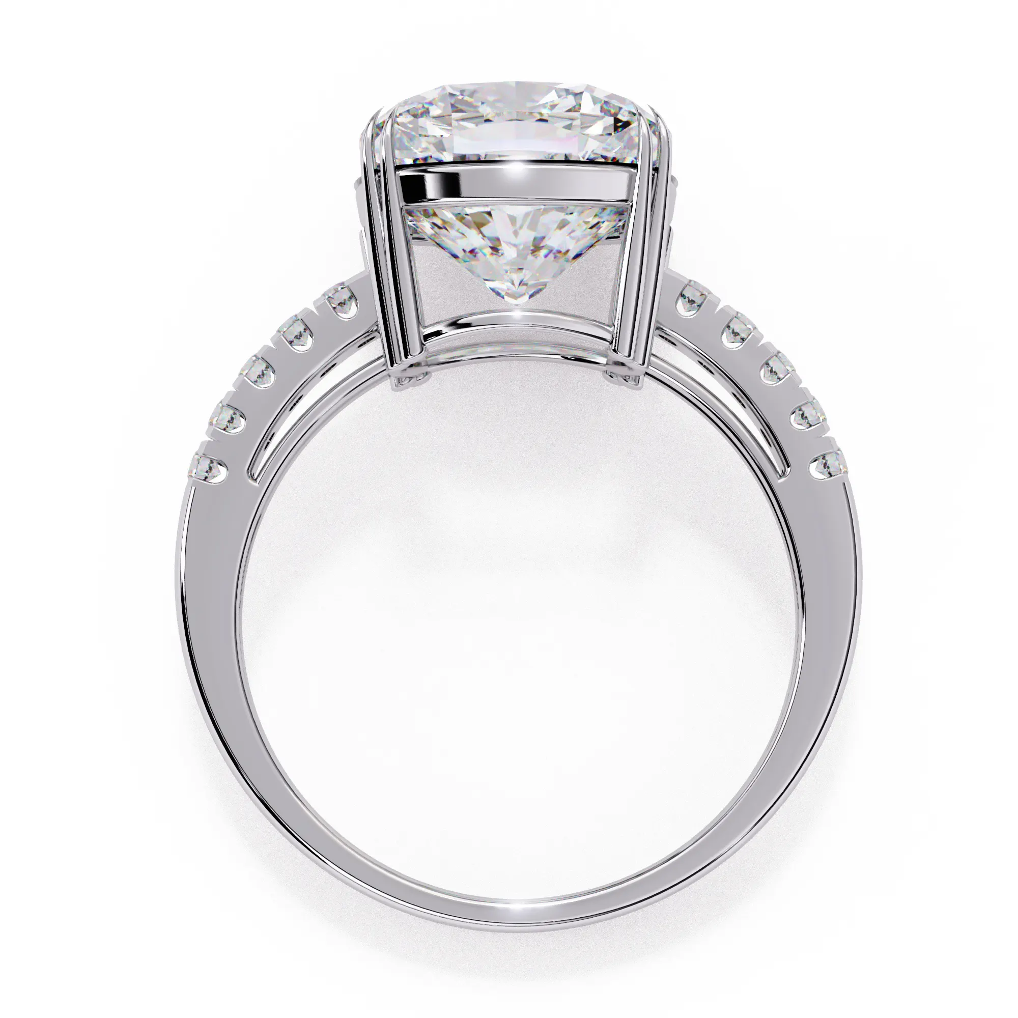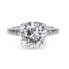 This elegant engagement ring features a stunning cushion-cut center diamond that captures light from every angle, creating exceptional brilliance. The elevated four-prong setting highlights the stone’s clarity while giving the design a refined, timeless character.
