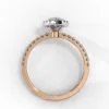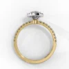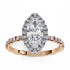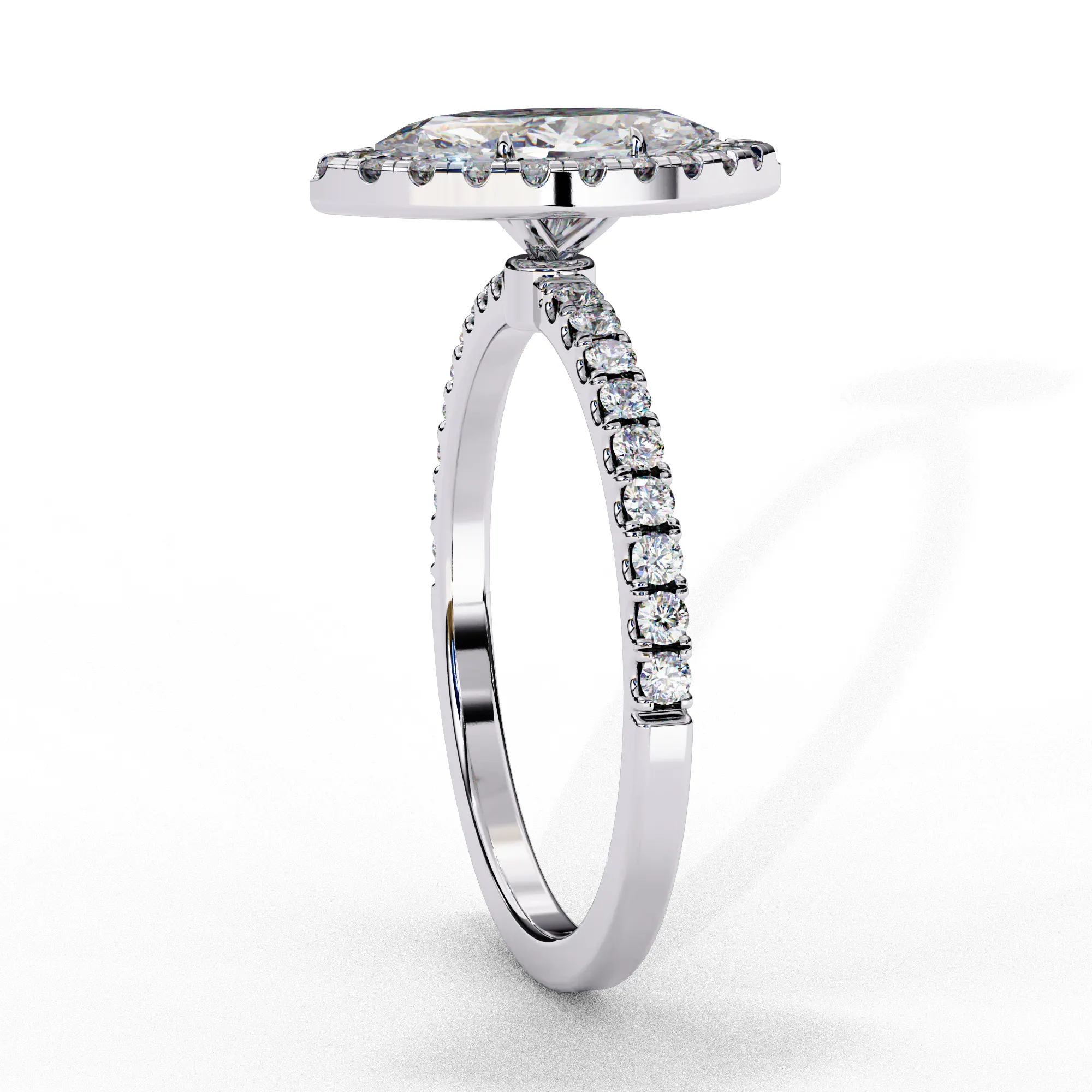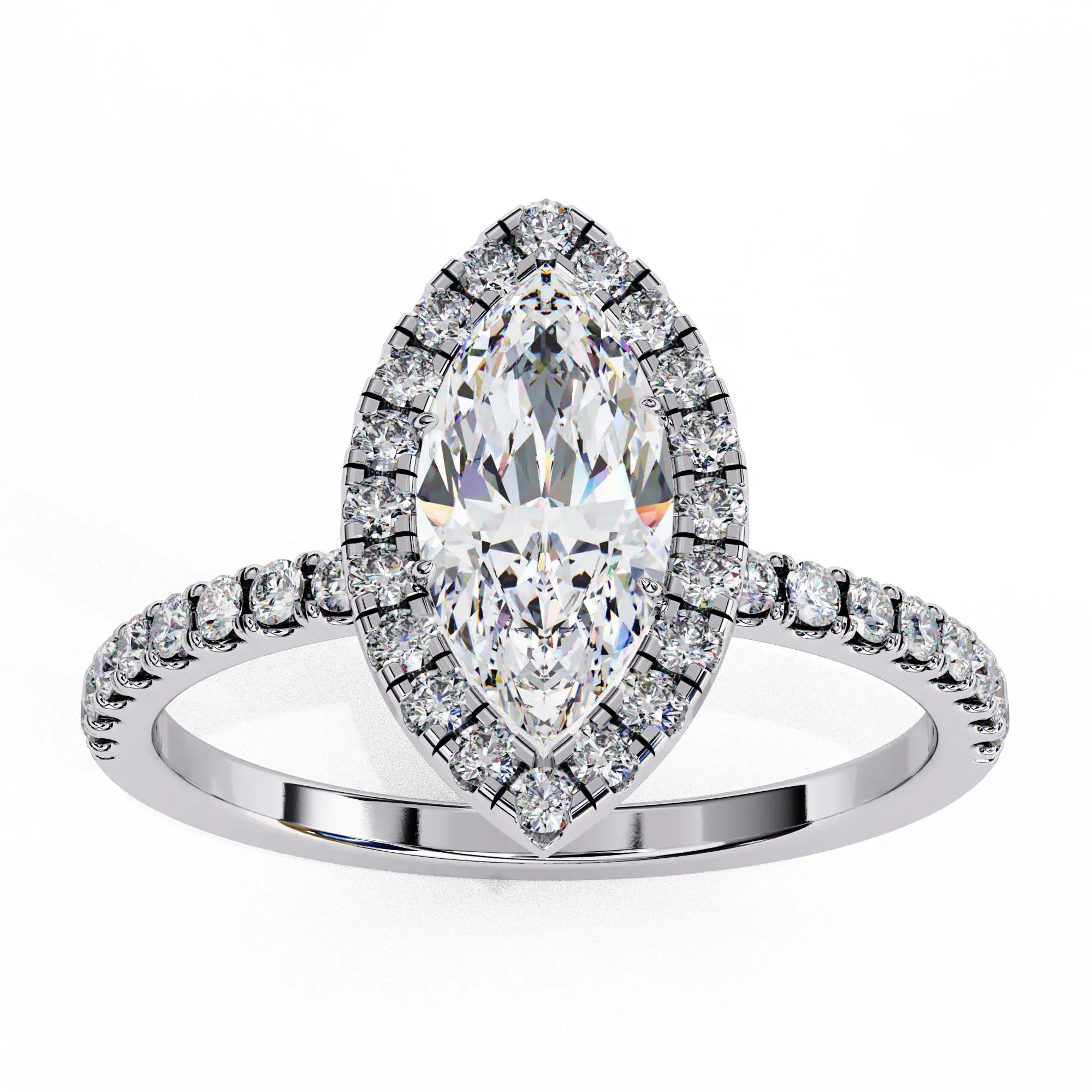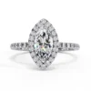 This captivating engagement ring features a striking marquise-cut center diamond framed by a shimmering double halo that enhances its elongated, graceful silhouette. The stone sits elegantly above a slim pavé band, adding continuous sparkle without overpowering the design.