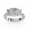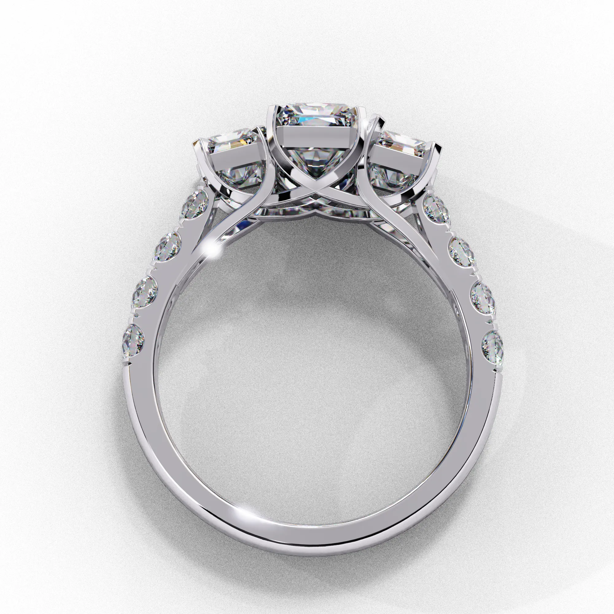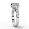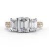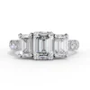 This elegant three-stone engagement ring features a striking emerald-cut trio that creates a bold, architectural silhouette with exceptional clarity and sparkle. The tapered side stones gracefully frame the center diamond, enhancing its presence and symmetry.