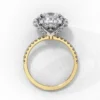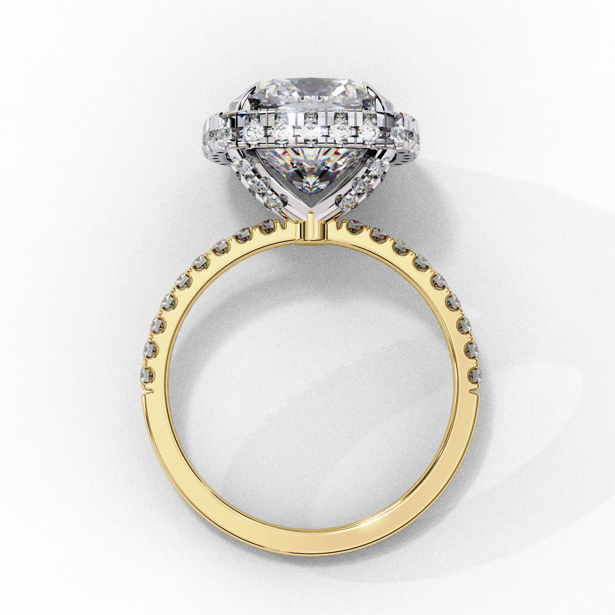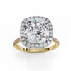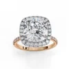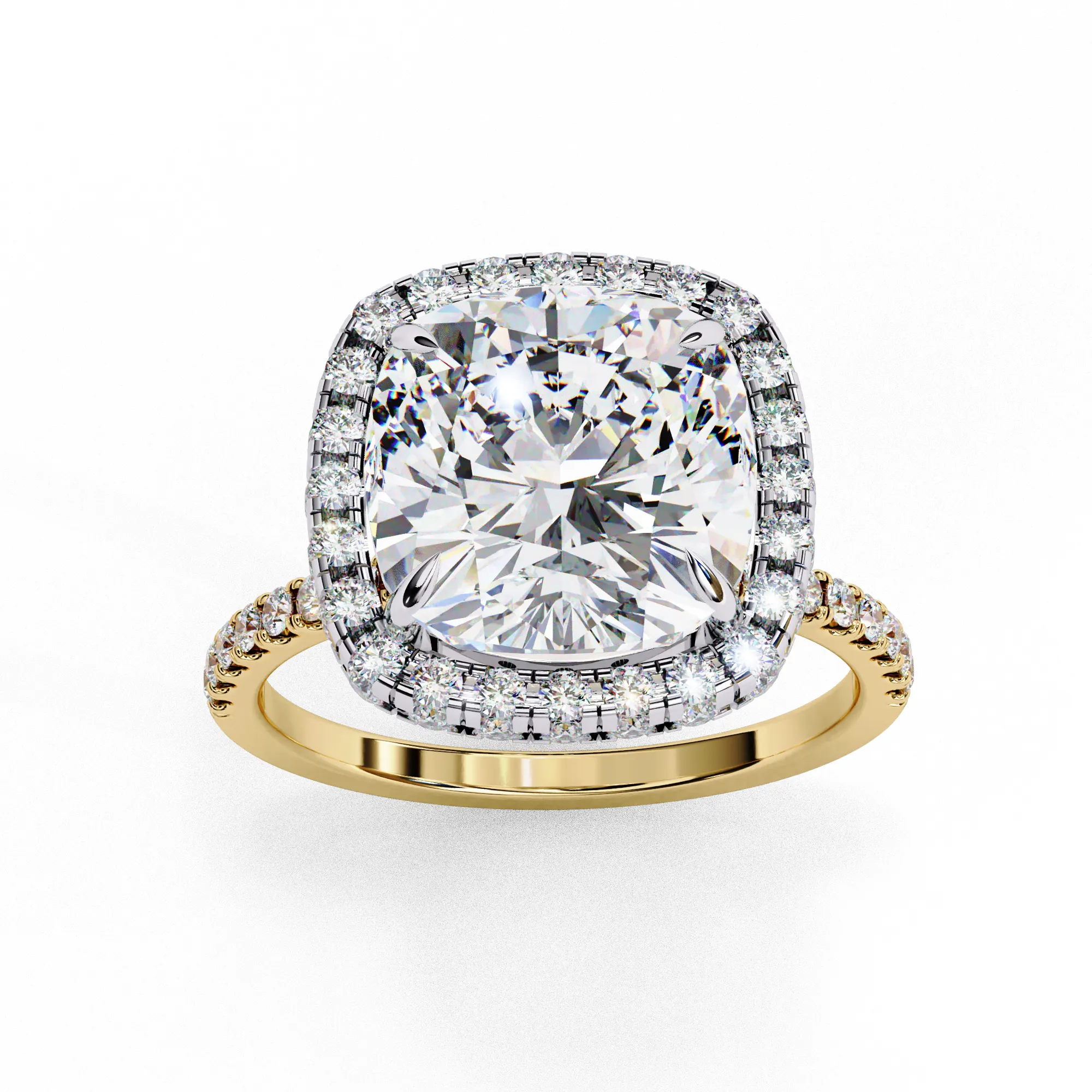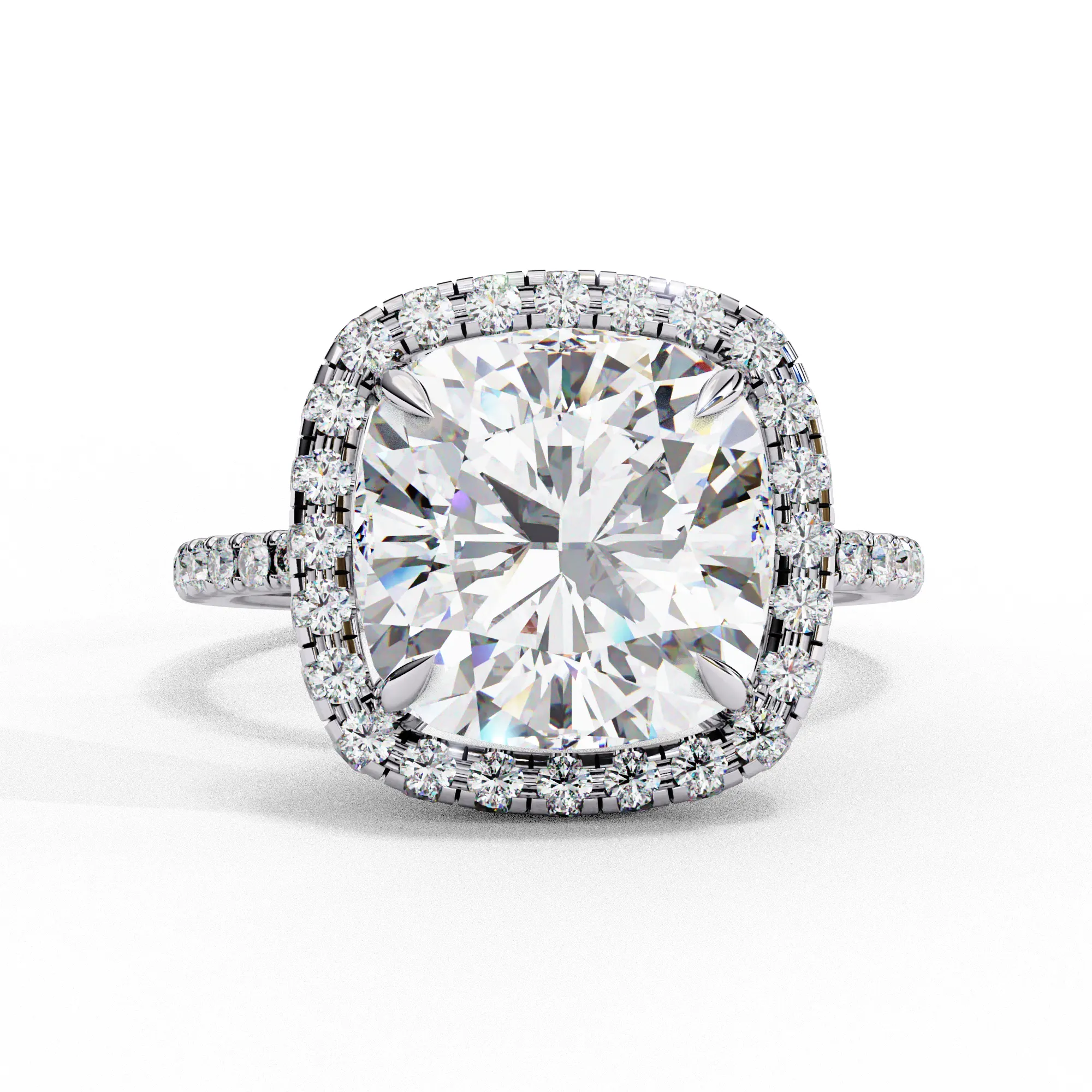 This cushion-cut halo engagement ring showcases a bold, brilliantly faceted center stone framed by a double halo that enhances its size and radiance. The elevated, intricately detailed gallery adds a luxurious architectural touch, allowing light to reflect beautifully from every angle.