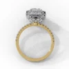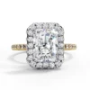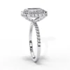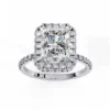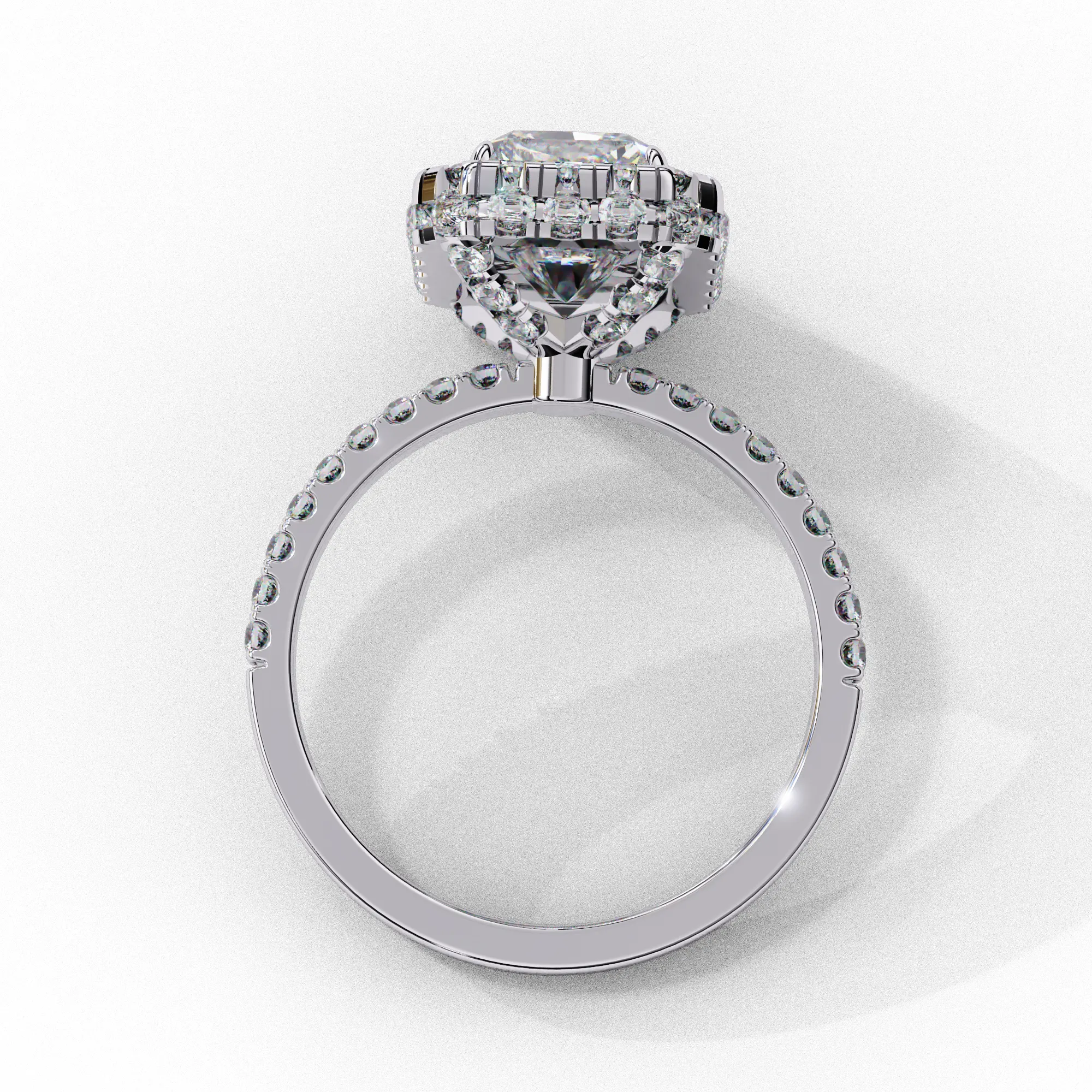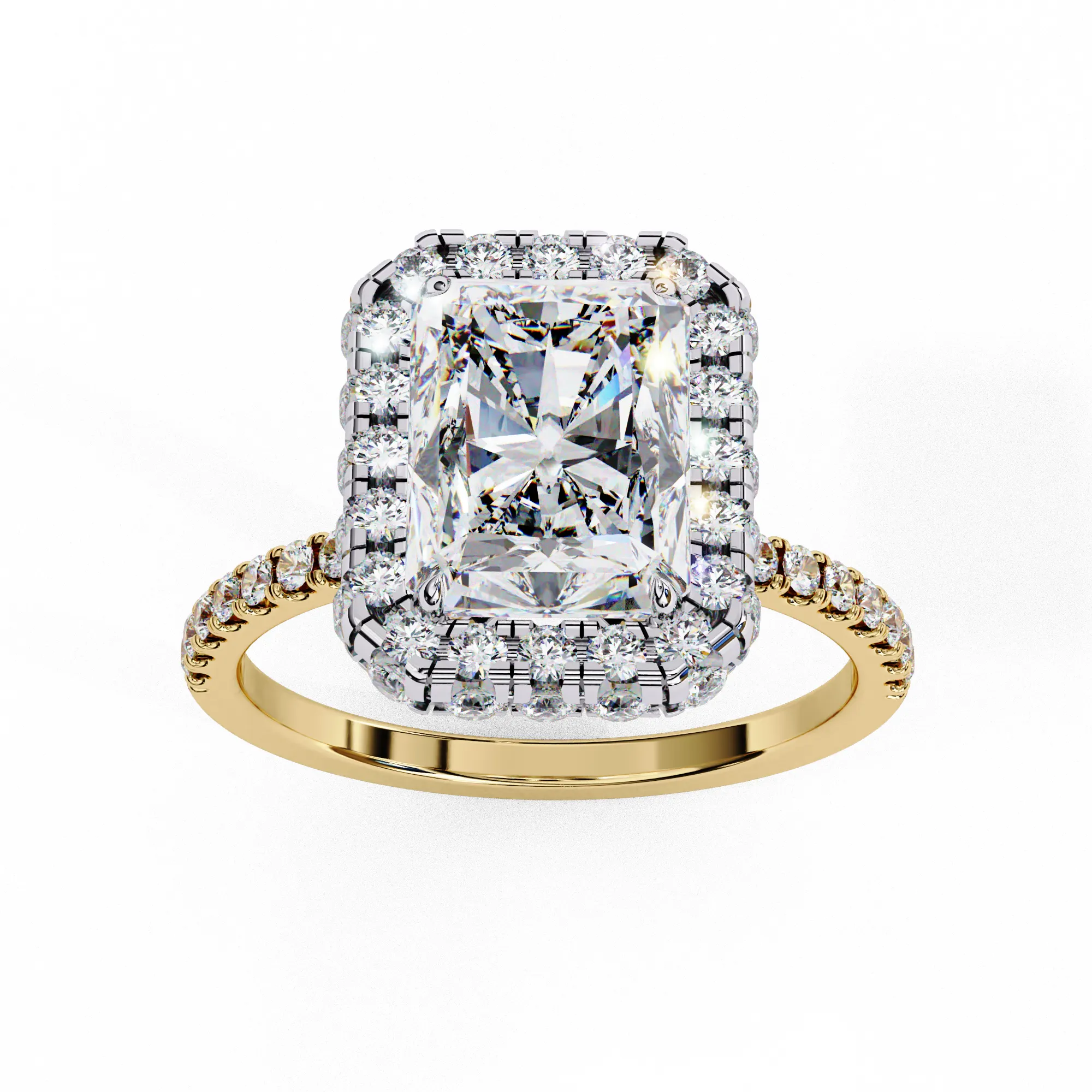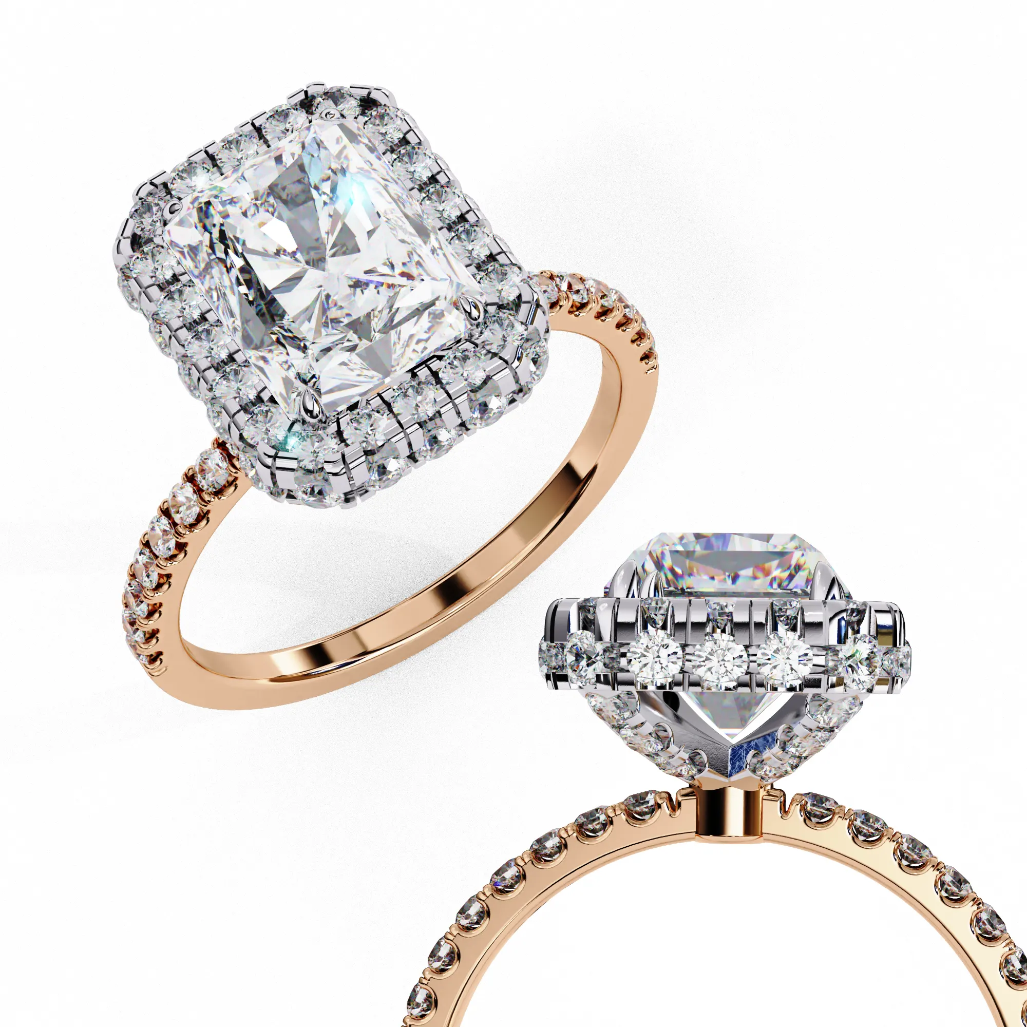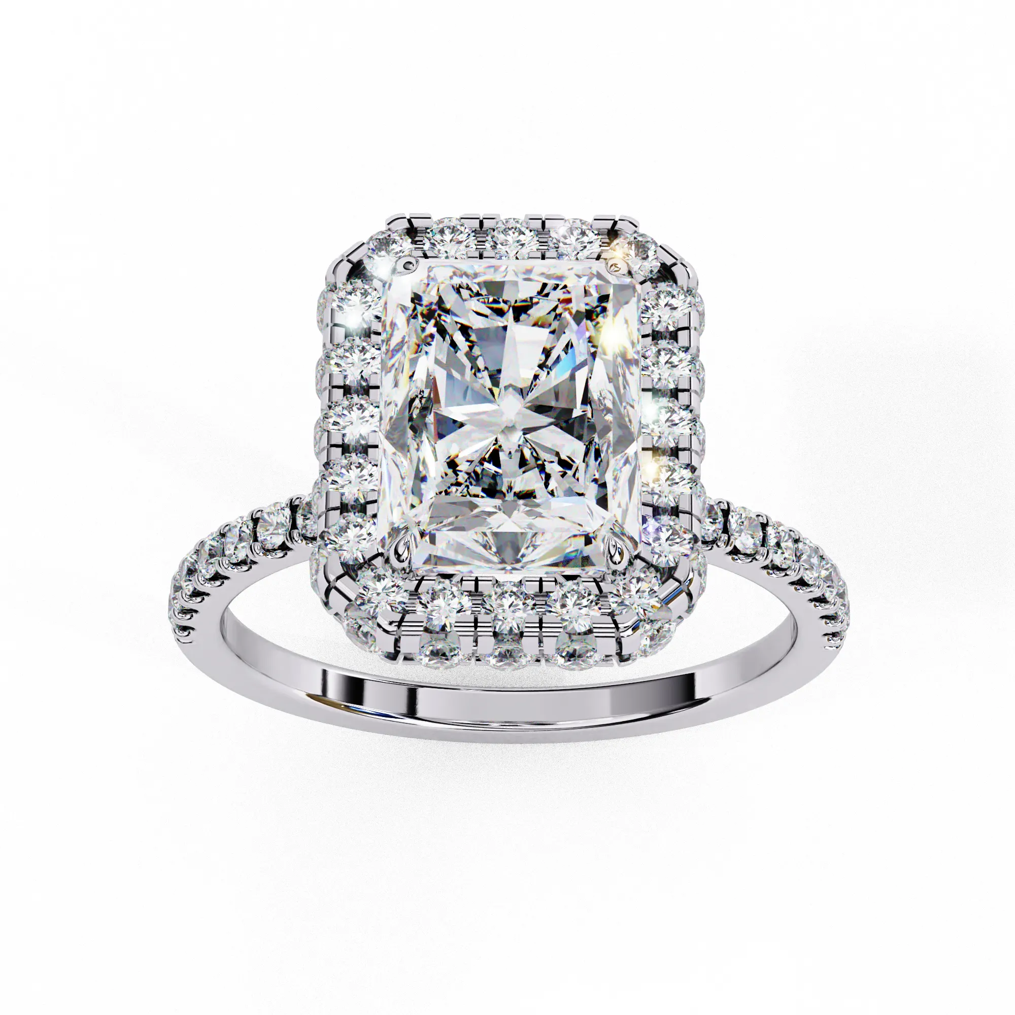 This striking double-halo engagement ring features a radiant-cut center stone framed by two rows of sparkling accent diamonds for extraordinary brilliance. The geometric halo design enhances the stone’s clean lines, creating a bold yet refined presence.
