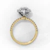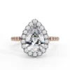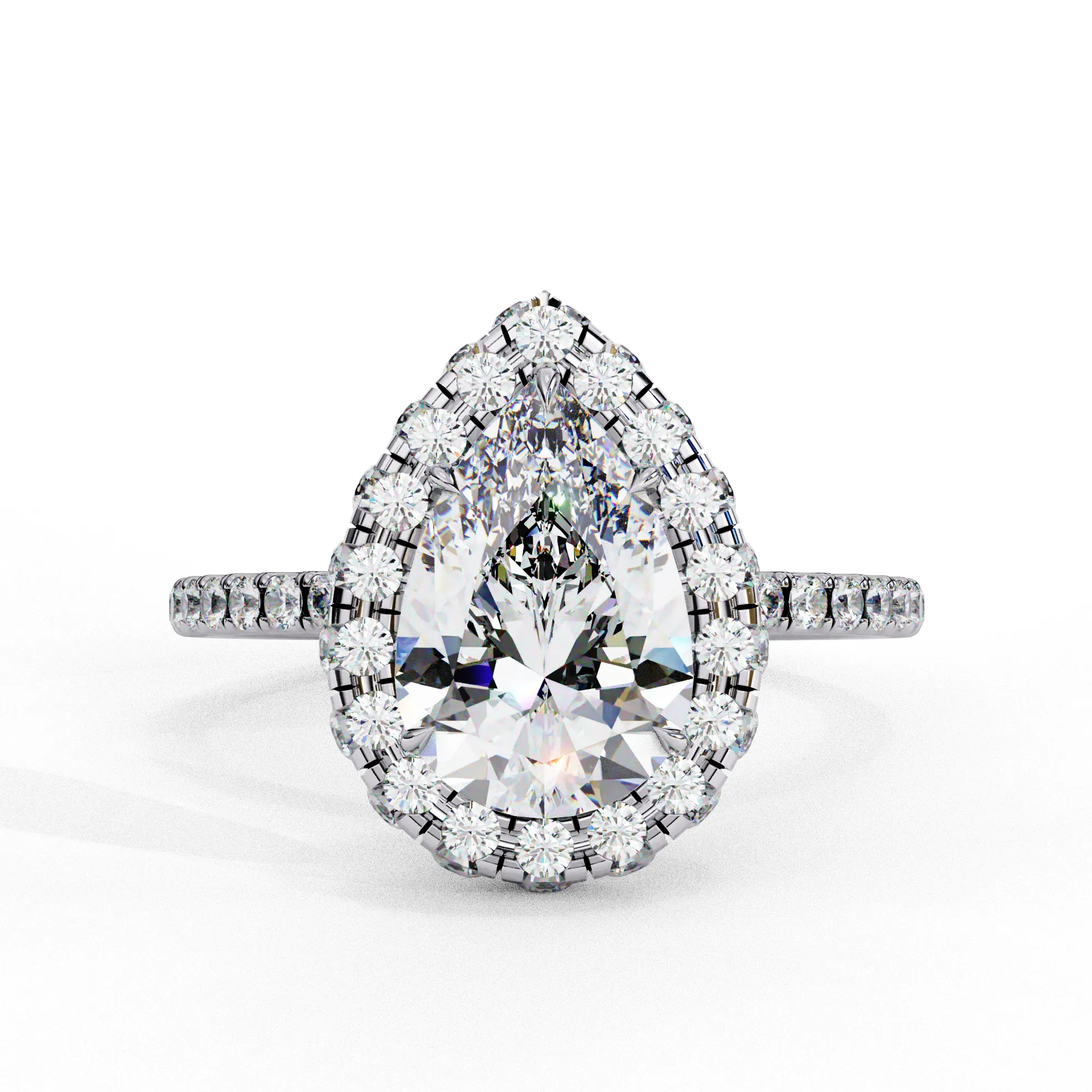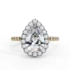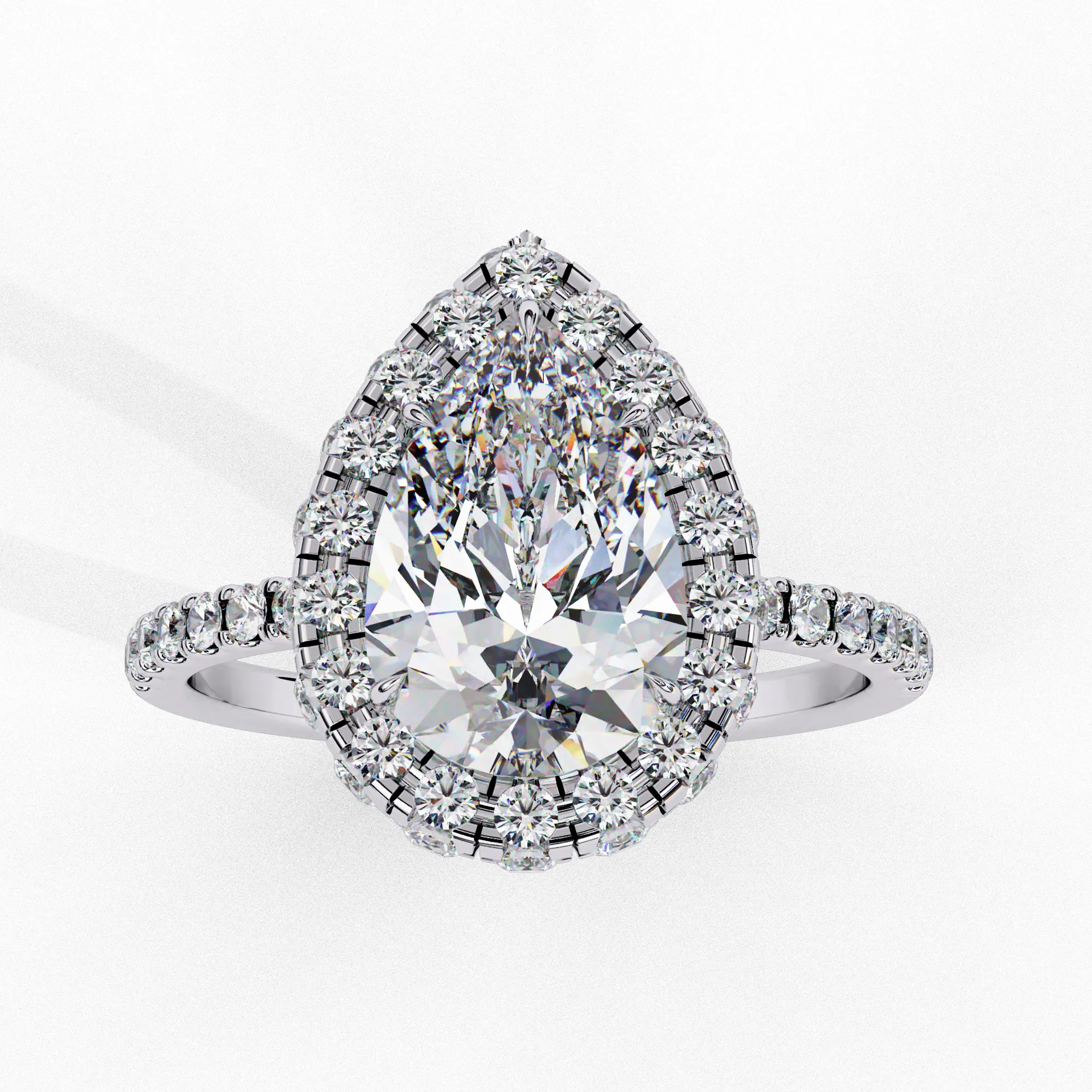This dazzling double-halo engagement ring highlights a stunning pear-shaped center stone encircled by two tiers of pavé diamonds. The layered halo enhances the teardrop silhouette, amplifying brilliance and creating a beautifully elongated, elegant look.