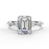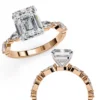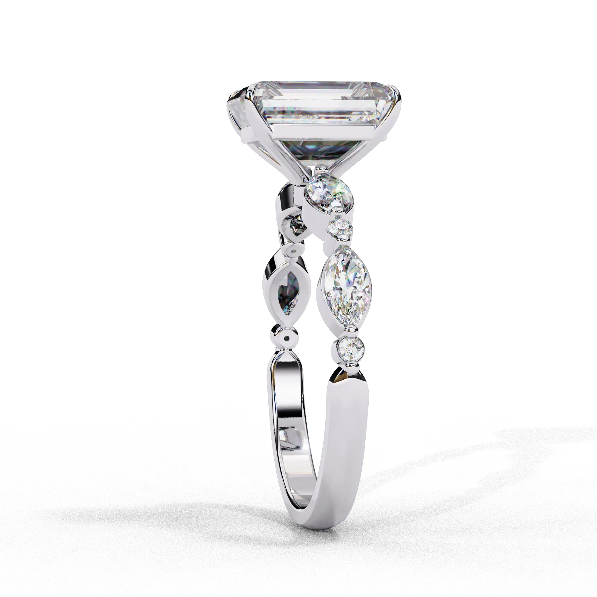 This sophisticated ring features an emerald-cut center stone framed by two marquise side stones that create a graceful, elongated silhouette. The combination of geometric lines and soft curves adds a refined balance to the design. A sleek, polished band enhances the brilliance of the centerpiece while maintaining a modern, luxurious feel.