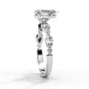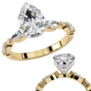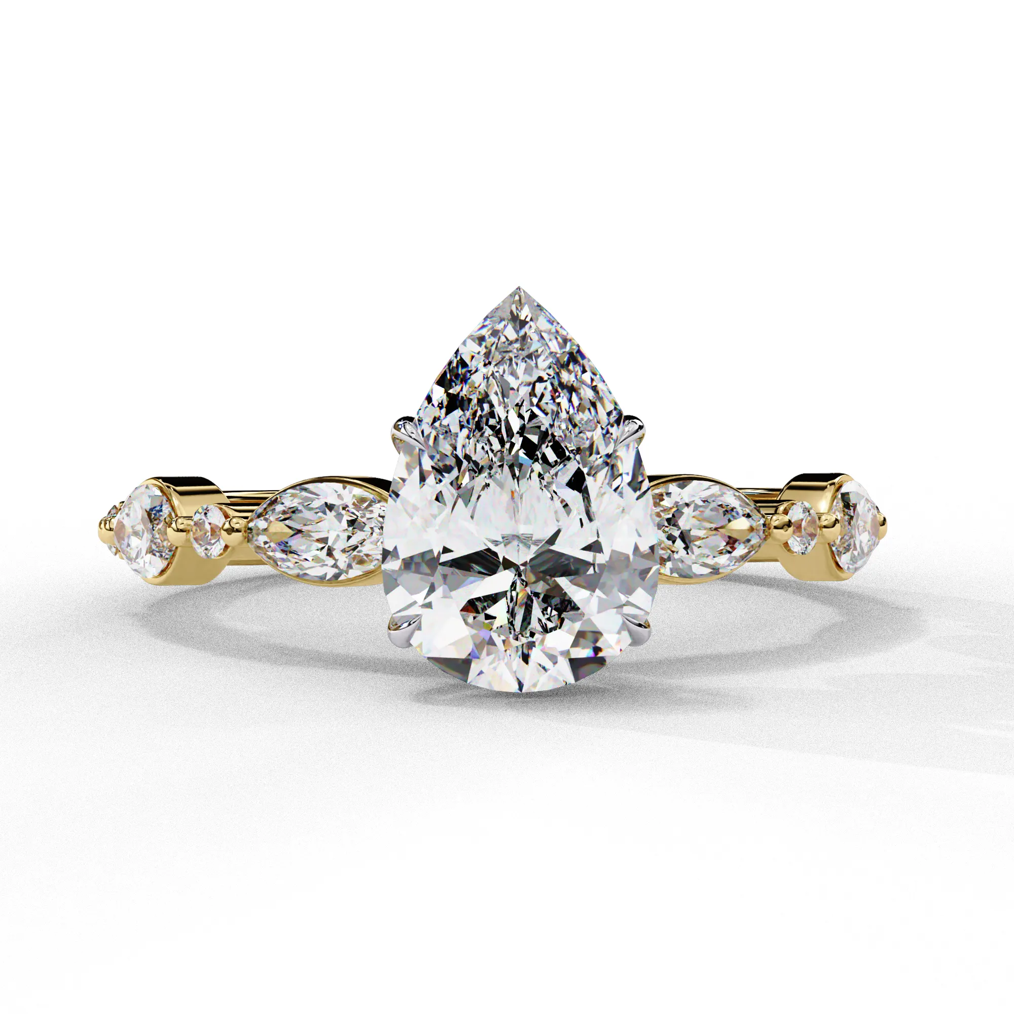 This ring features a stunning pear-cut center diamond that brings a bold, elongated elegance to the design. Marquise and round side stones flow gracefully along the band, enhancing the brilliance and adding a refined sense of symmetry.