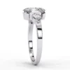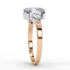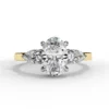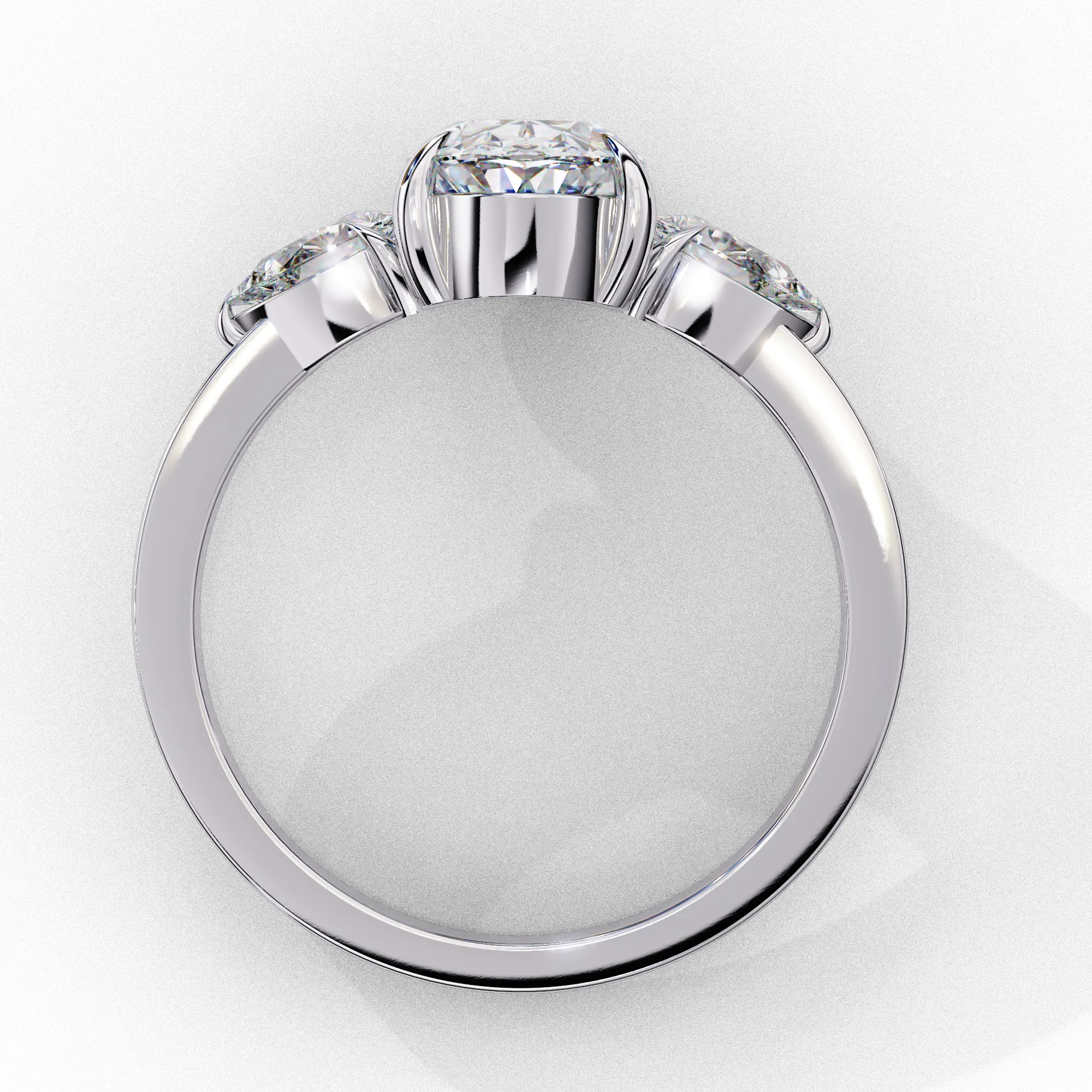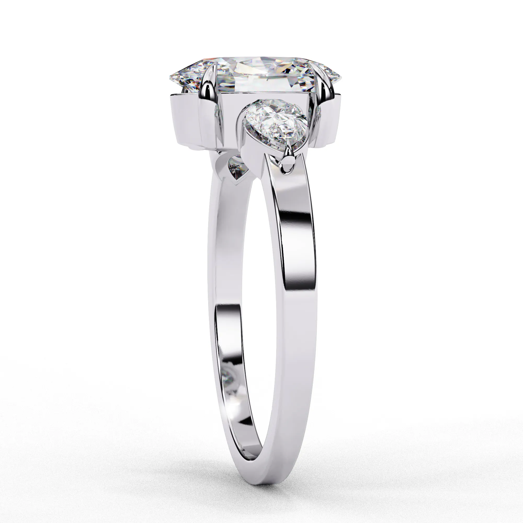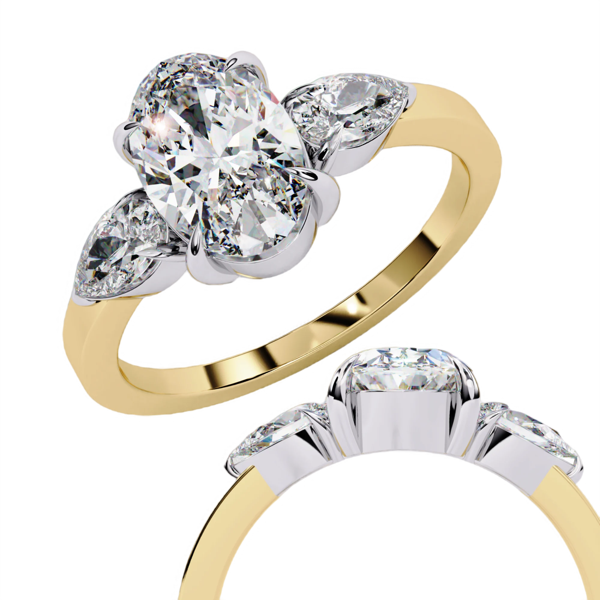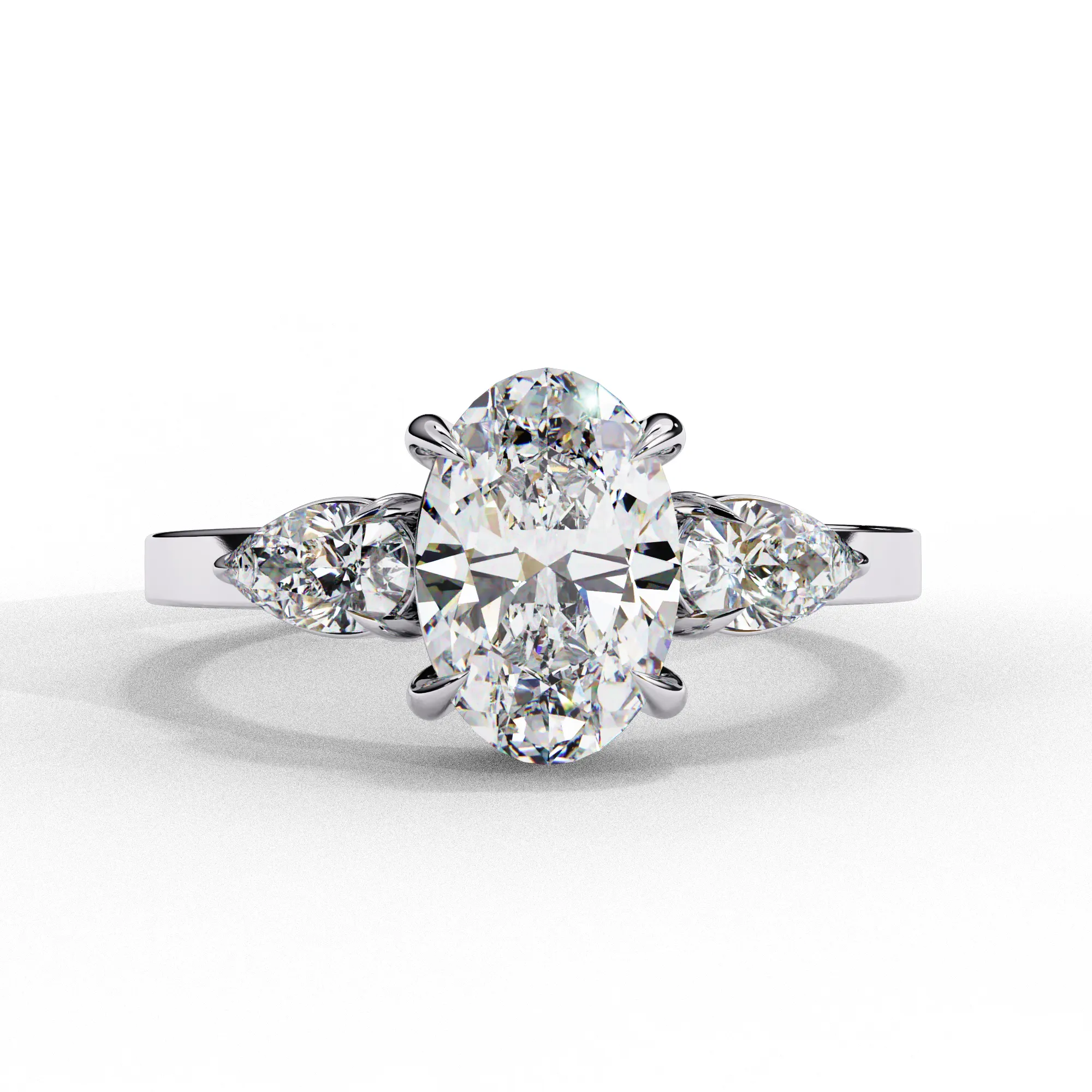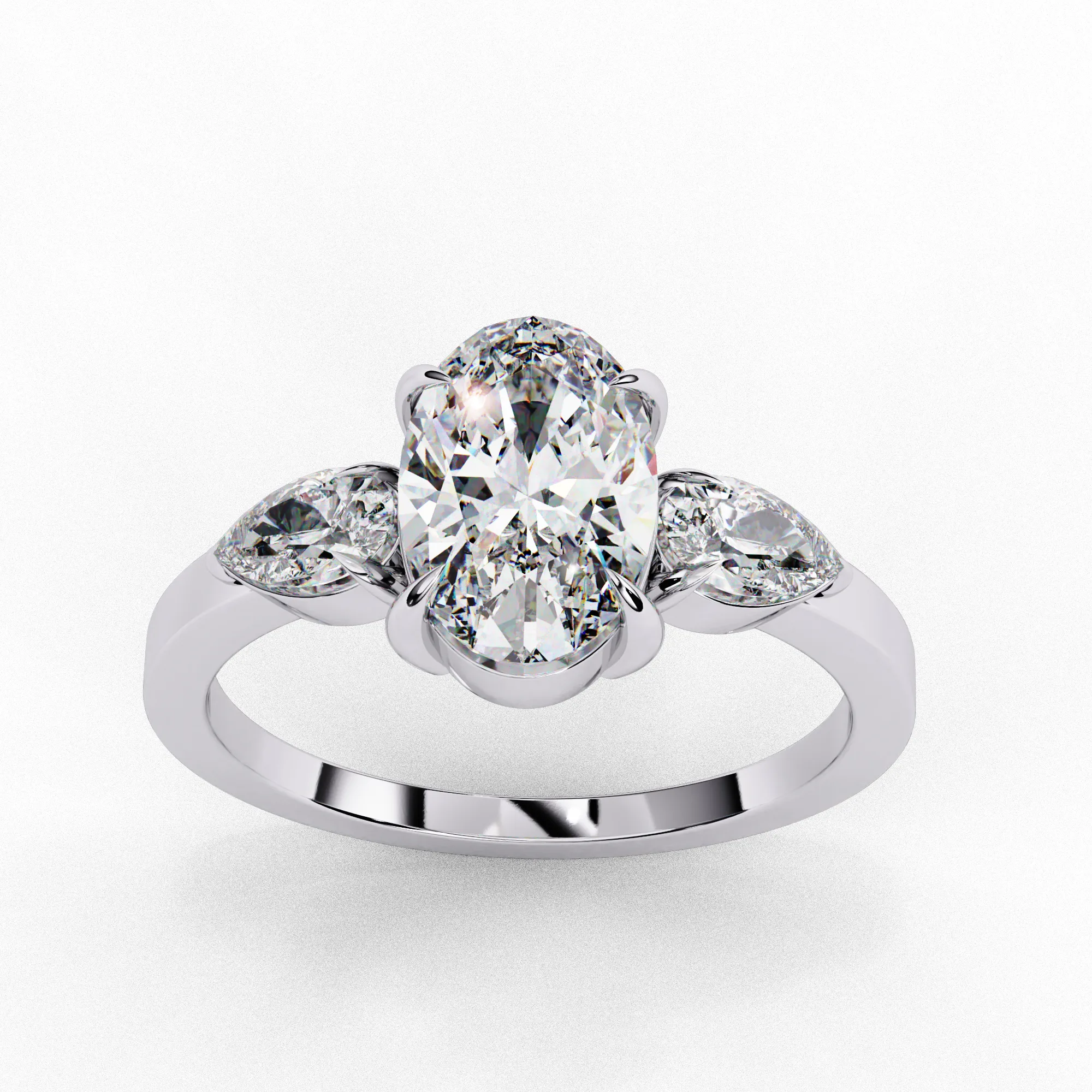 This elegant three-stone ring centers around a dazzling oval diamond secured in a soft, sculptural four-prong setting. Two pear-shaped side stones nestle closely against the center, enhancing its brilliance and creating a graceful, tapered silhouette.