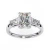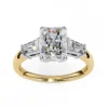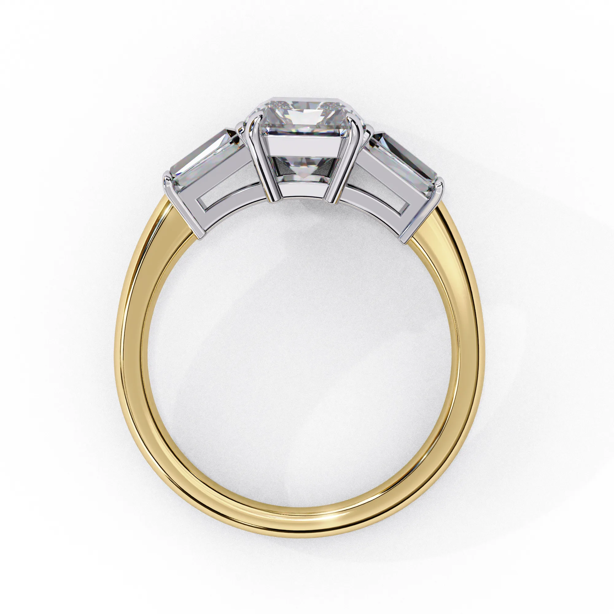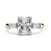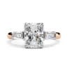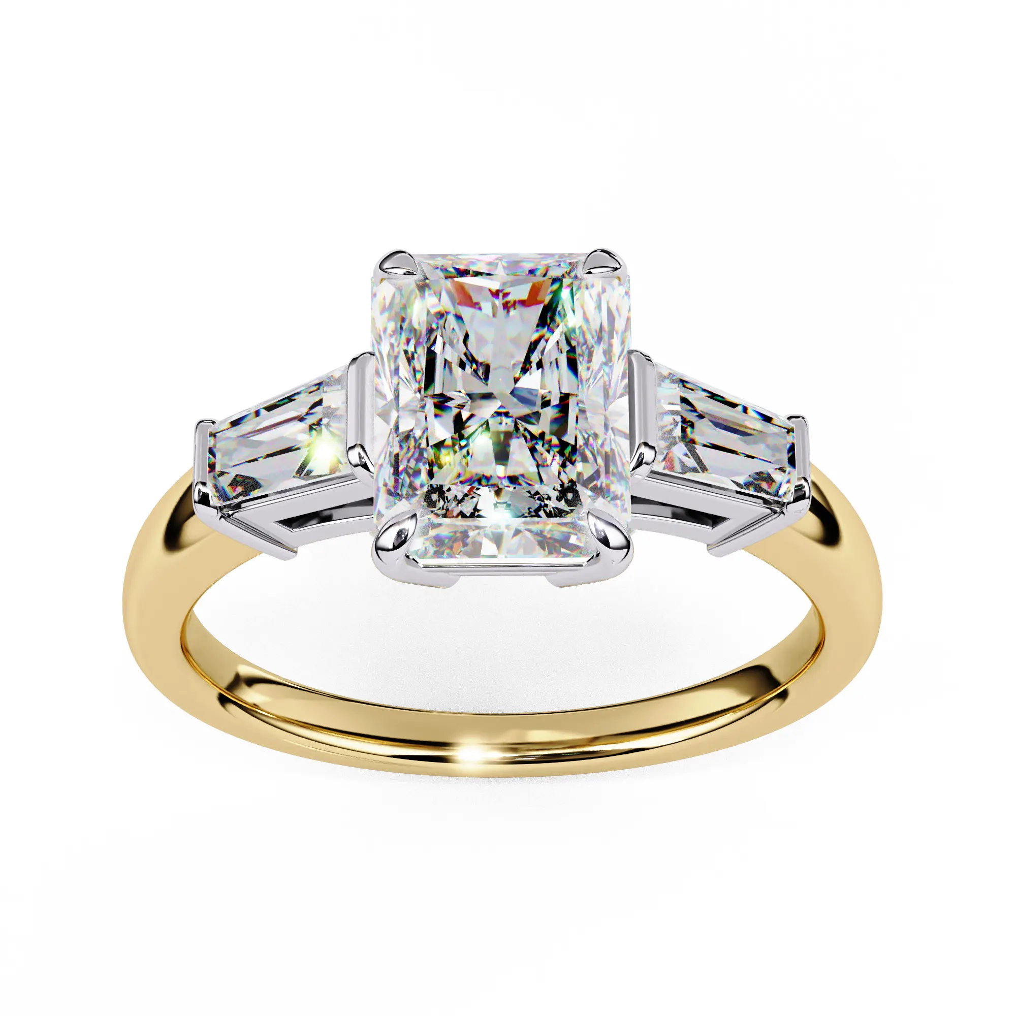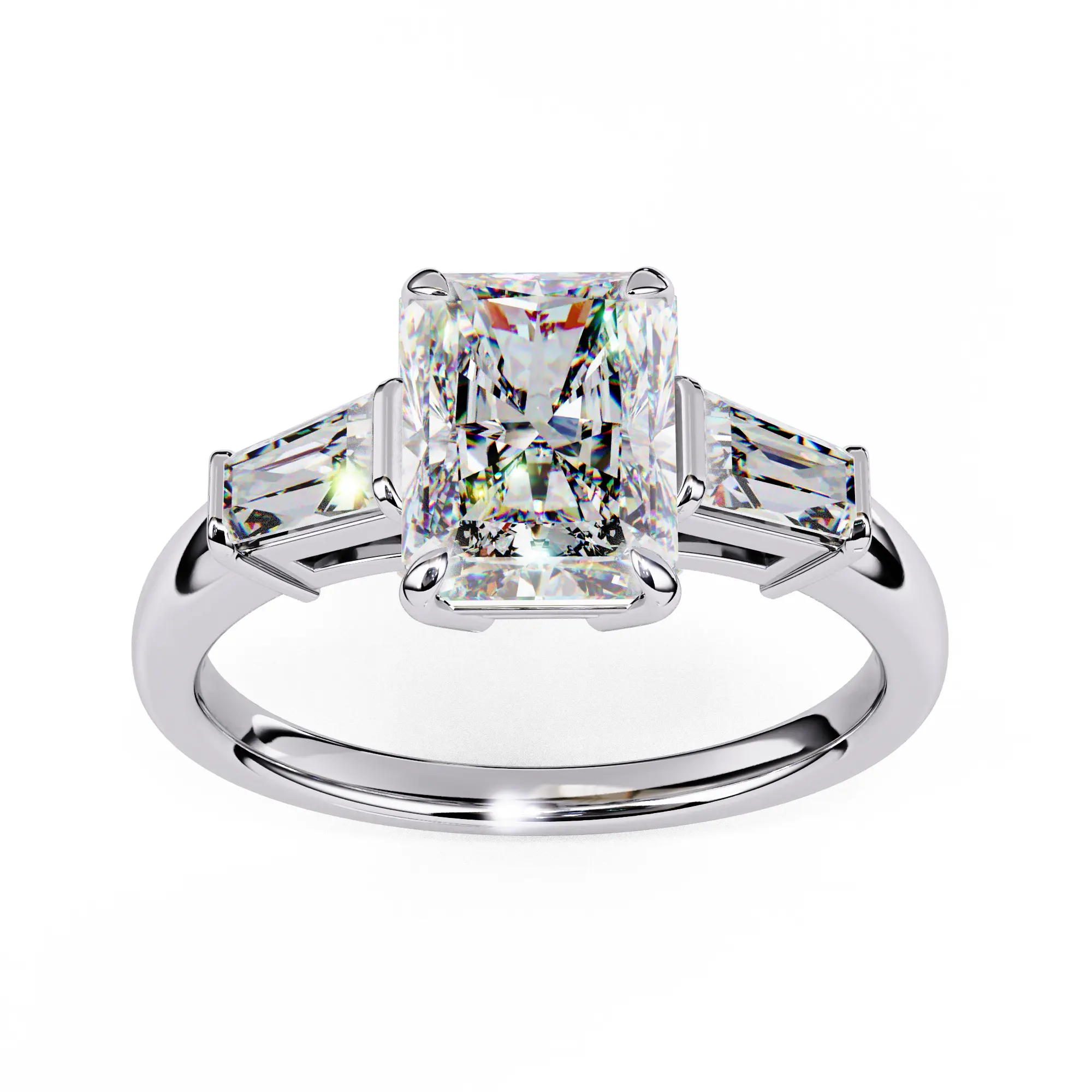 This sophisticated ring features a radiant-cut center diamond, showcased in a clean four-prong setting that enhances its crisp geometry and brilliance. On each side, tapered baguette diamonds create a seamless transition, adding an elegant architectural flair.