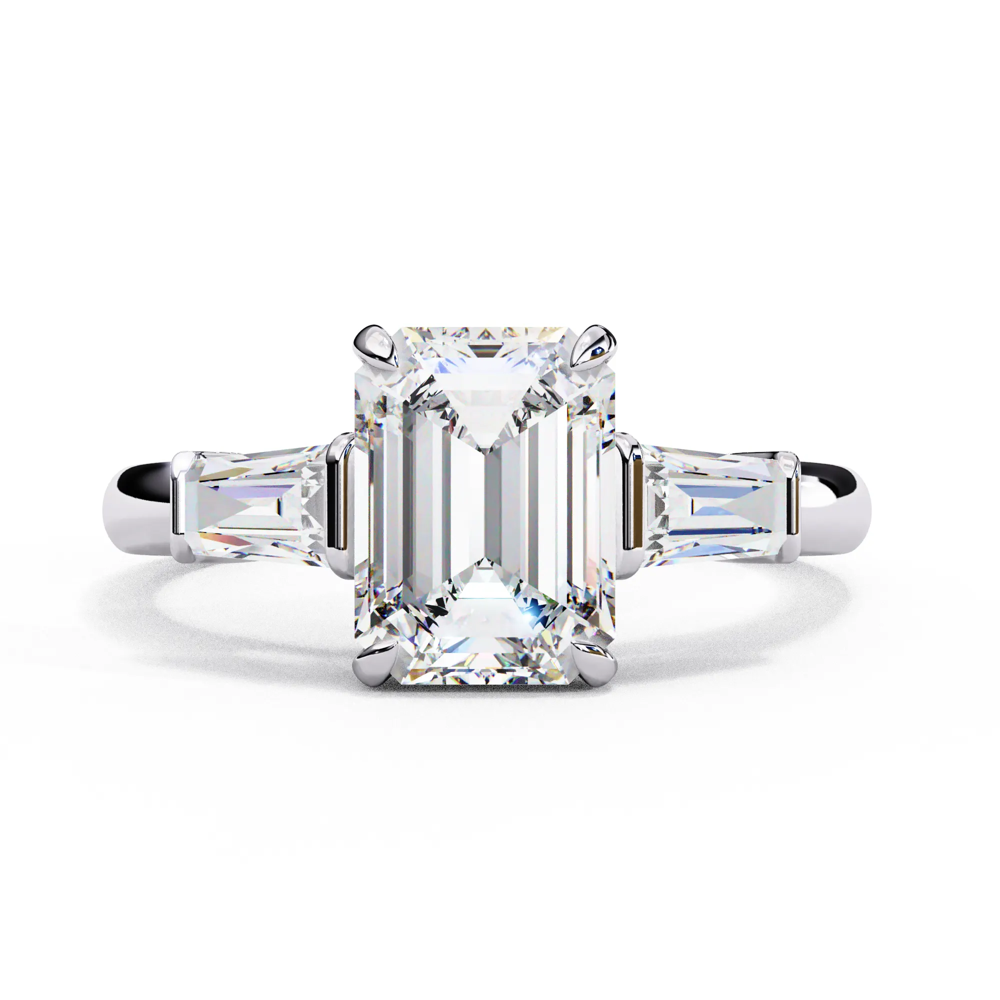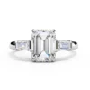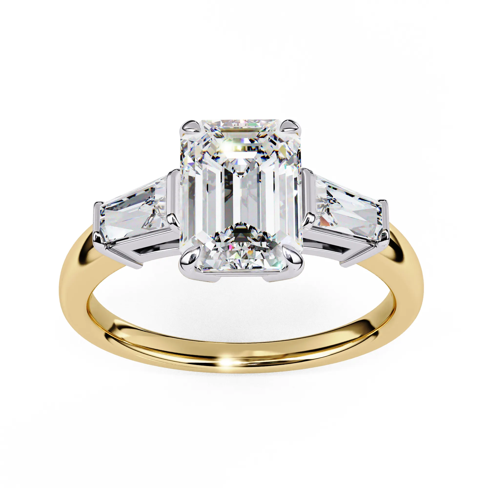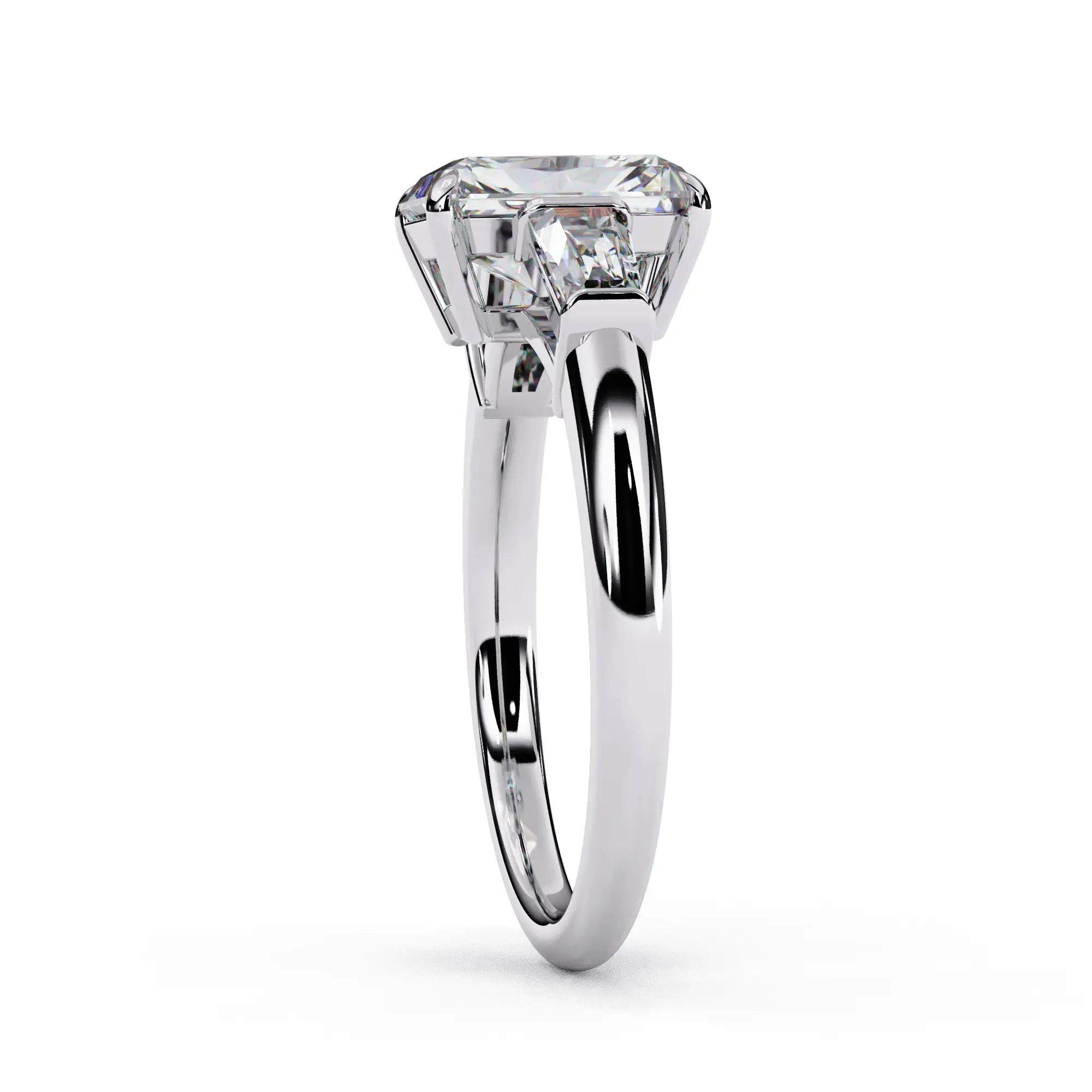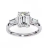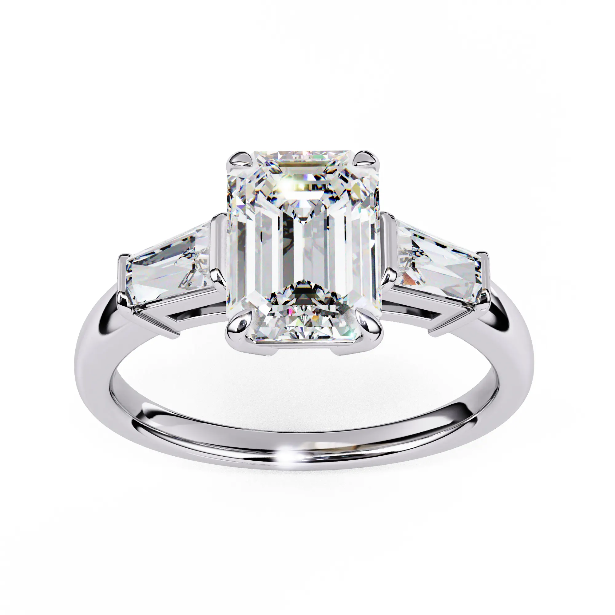This refined three-stone ring features an emerald-cut center diamond framed by tapered baguette side stones, creating a clean, architectural silhouette. The crisp step-cut facets highlight clarity and depth, giving the ring a sophisticated, modern presence.