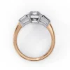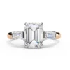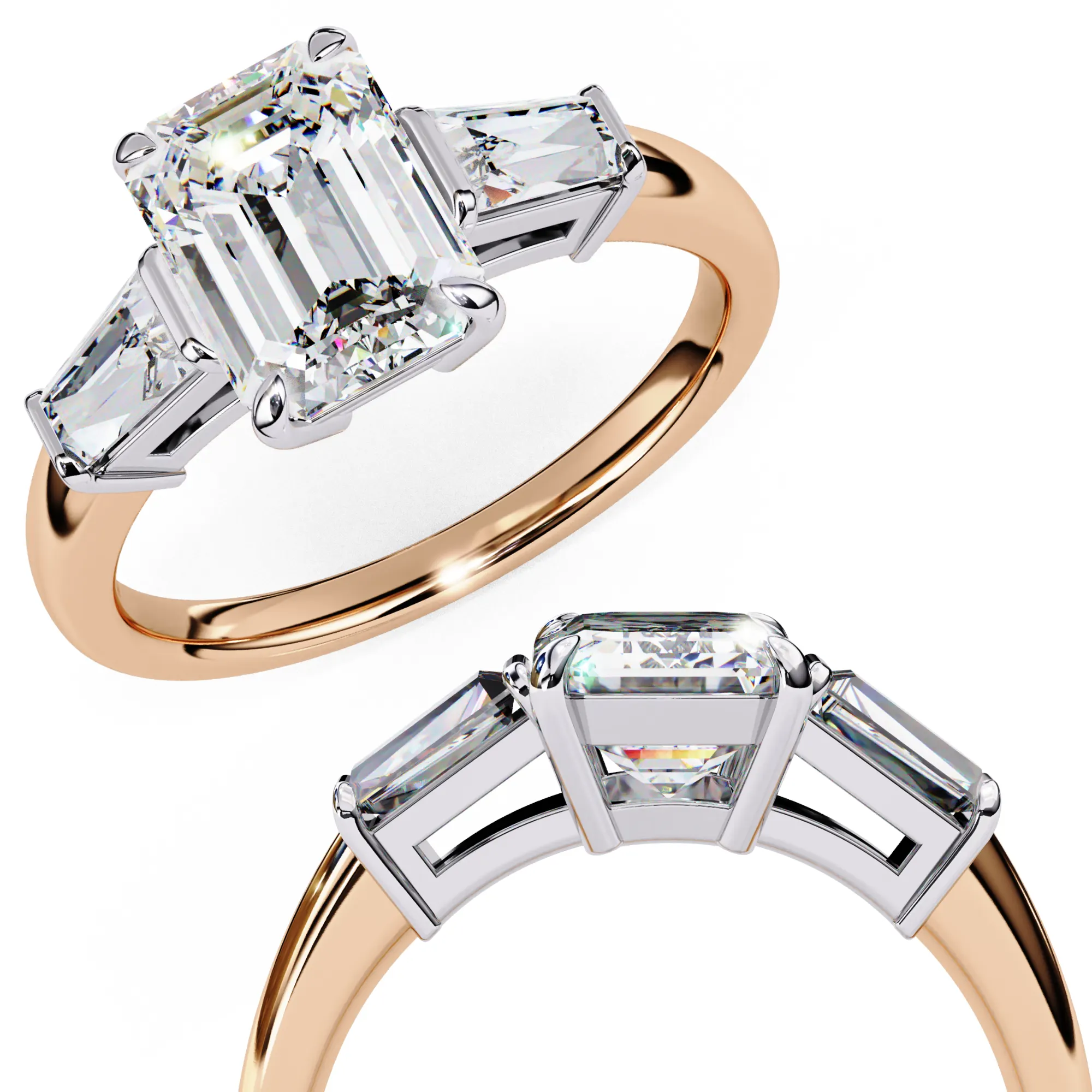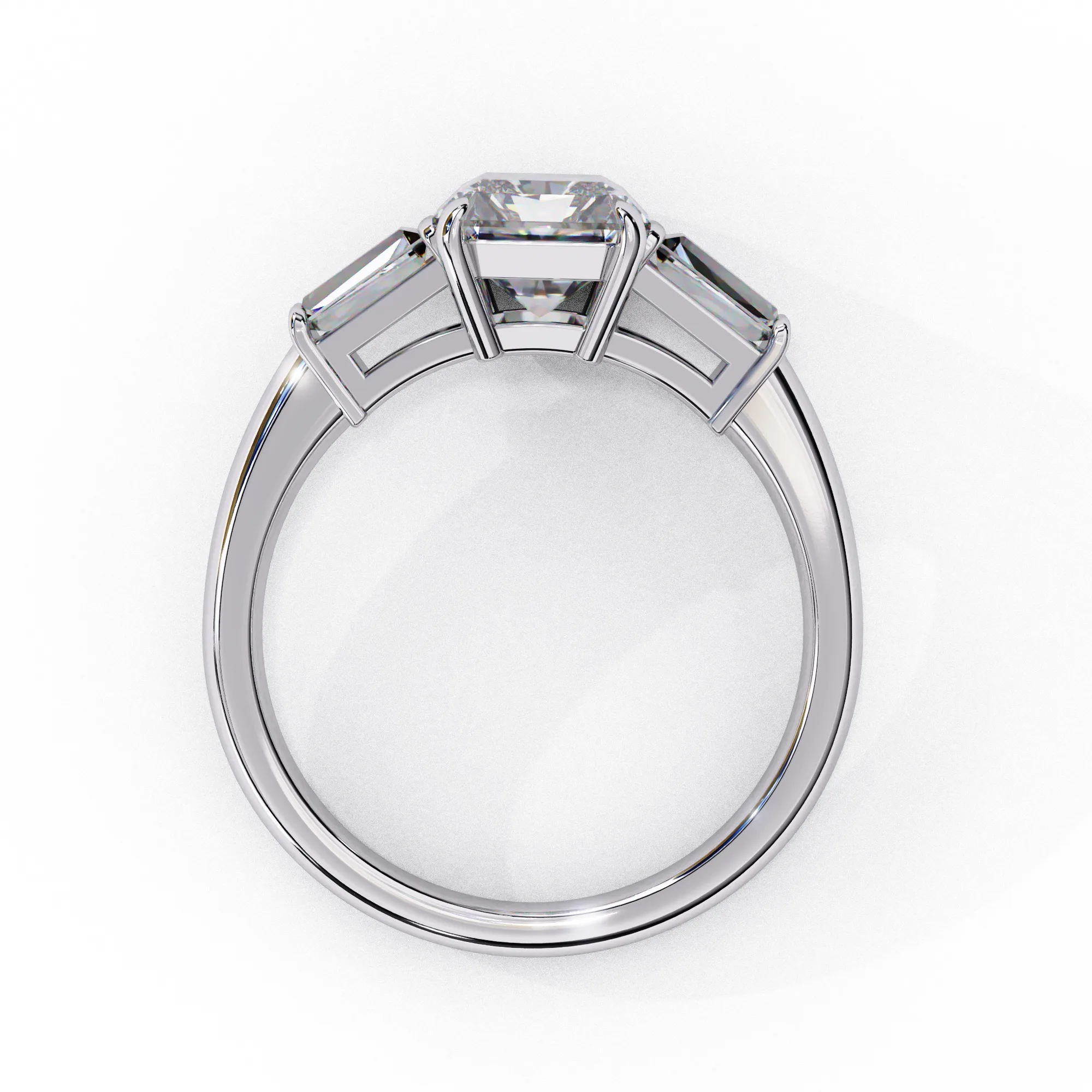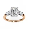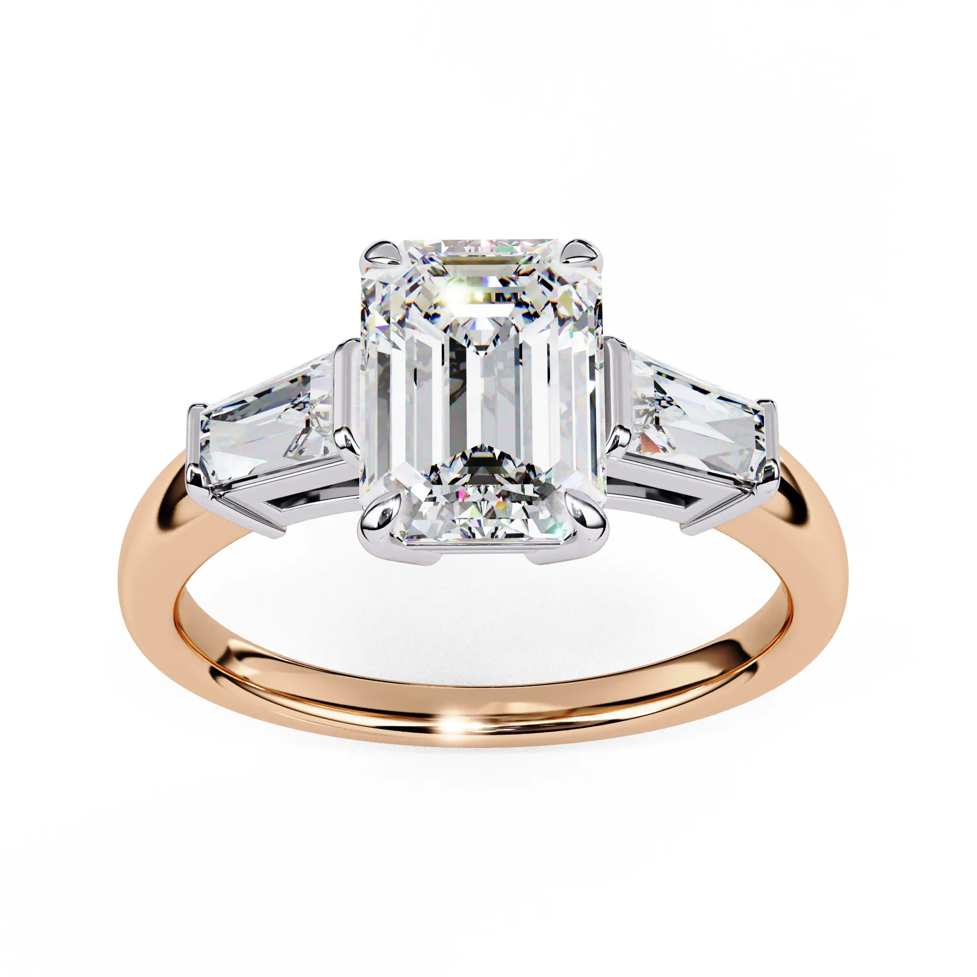 This refined three-stone ring features an emerald-cut center diamond framed by tapered baguette side stones, creating a clean, architectural silhouette. The crisp step-cut facets highlight clarity and depth, giving the ring a sophisticated, modern presence.