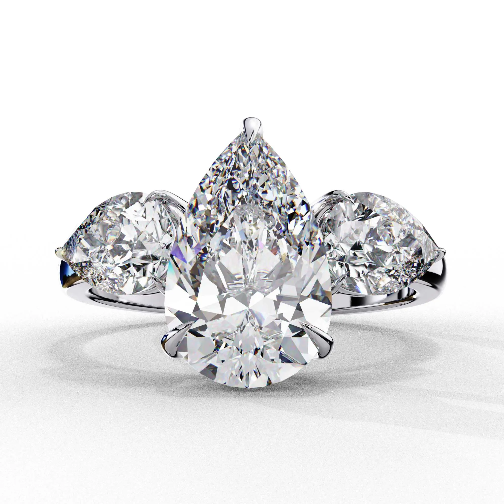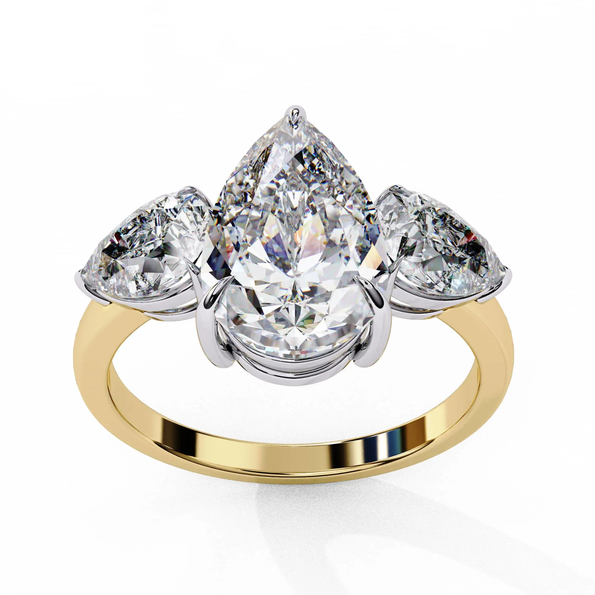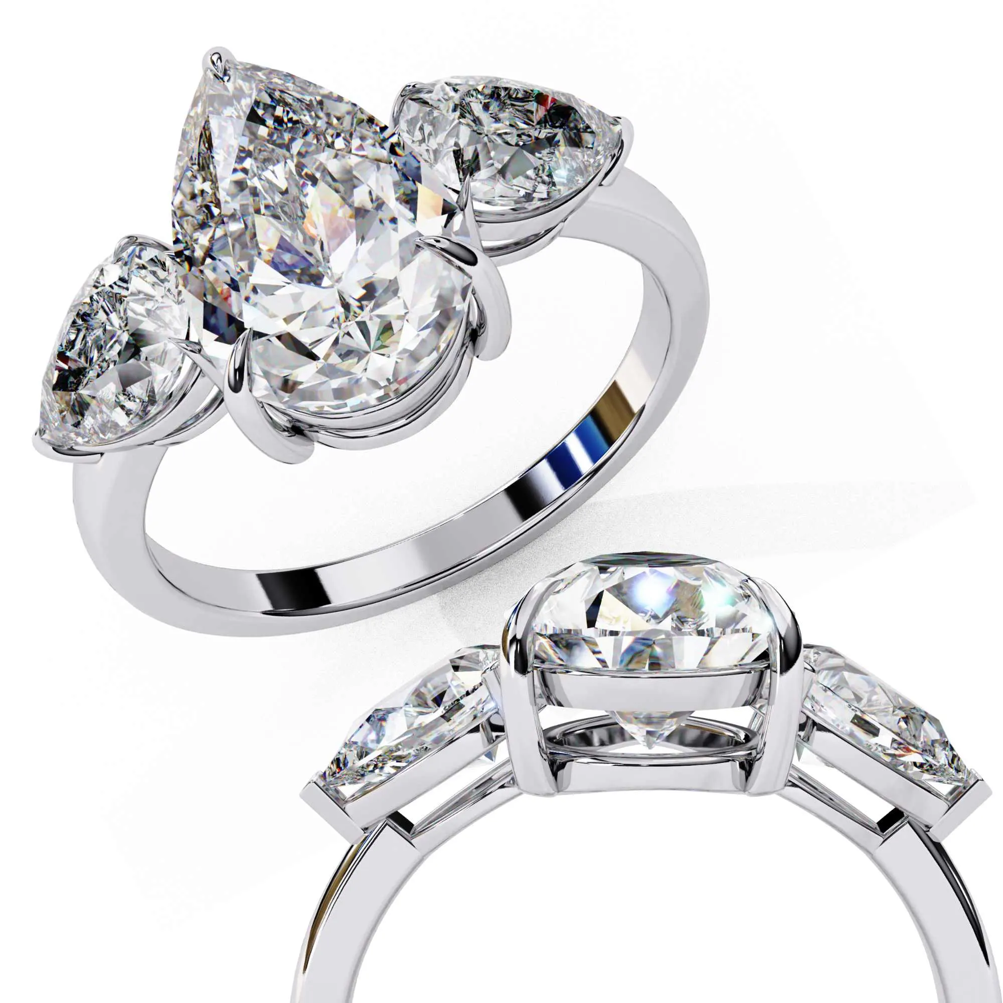 This elegant three-stone ring features a striking pear-shaped center diamond paired with two matching pear side stones, creating a perfectly balanced and luminous silhouette. The soft, curved prongs frame each stone securely while maintaining an airy, refined look.