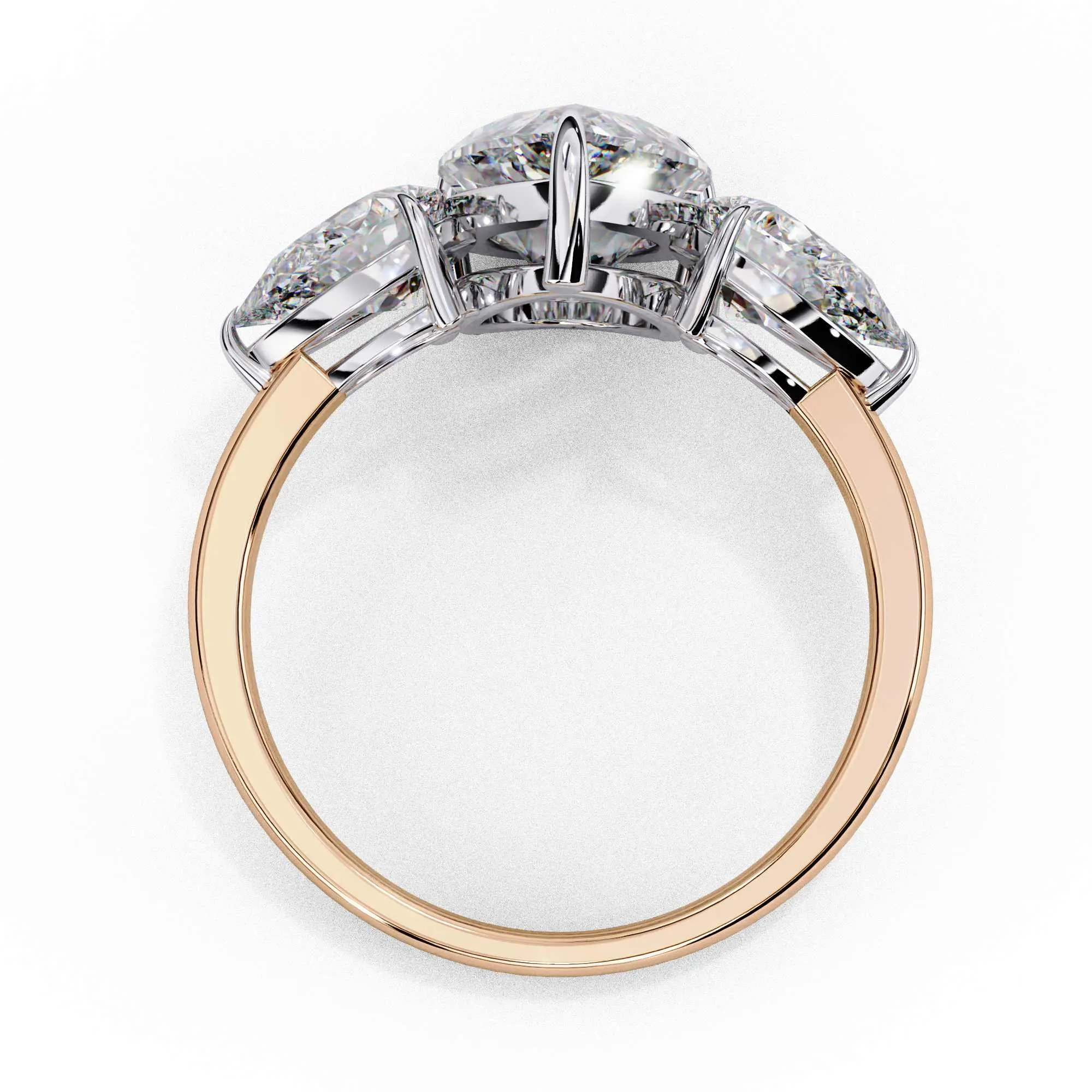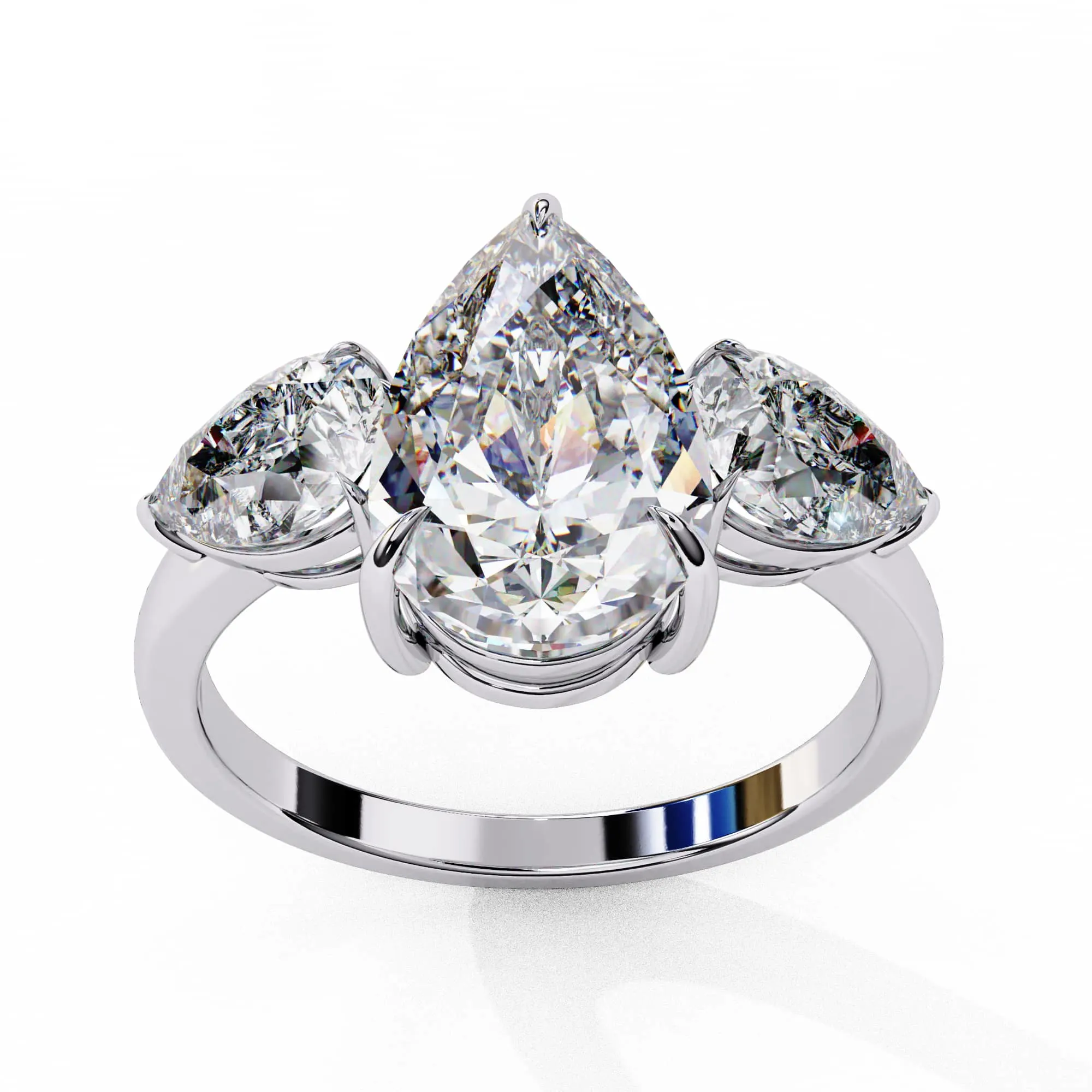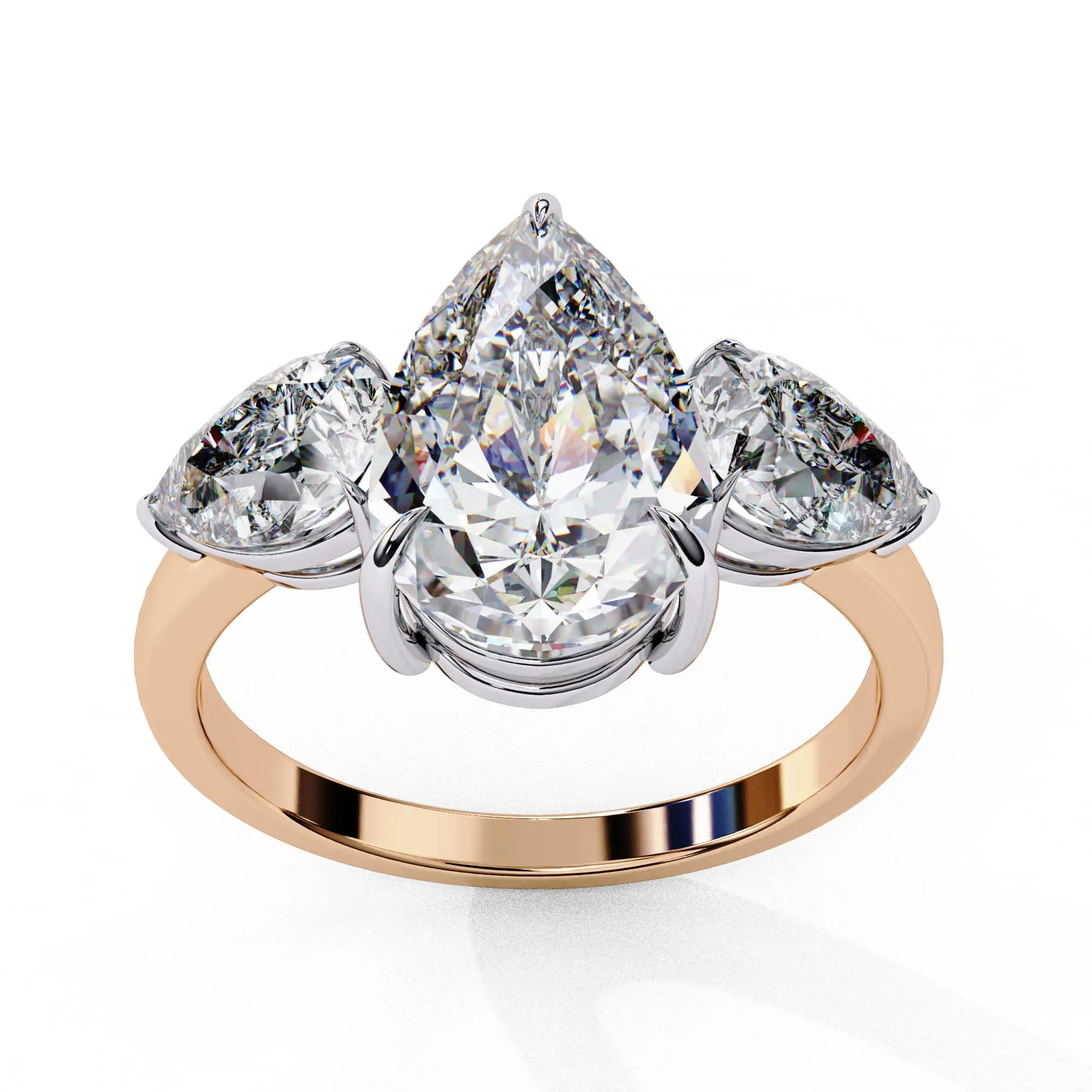 This elegant three-stone ring features a striking pear-shaped center diamond paired with two matching pear side stones, creating a perfectly balanced and luminous silhouette. The soft, curved prongs frame each stone securely while maintaining an airy, refined look.