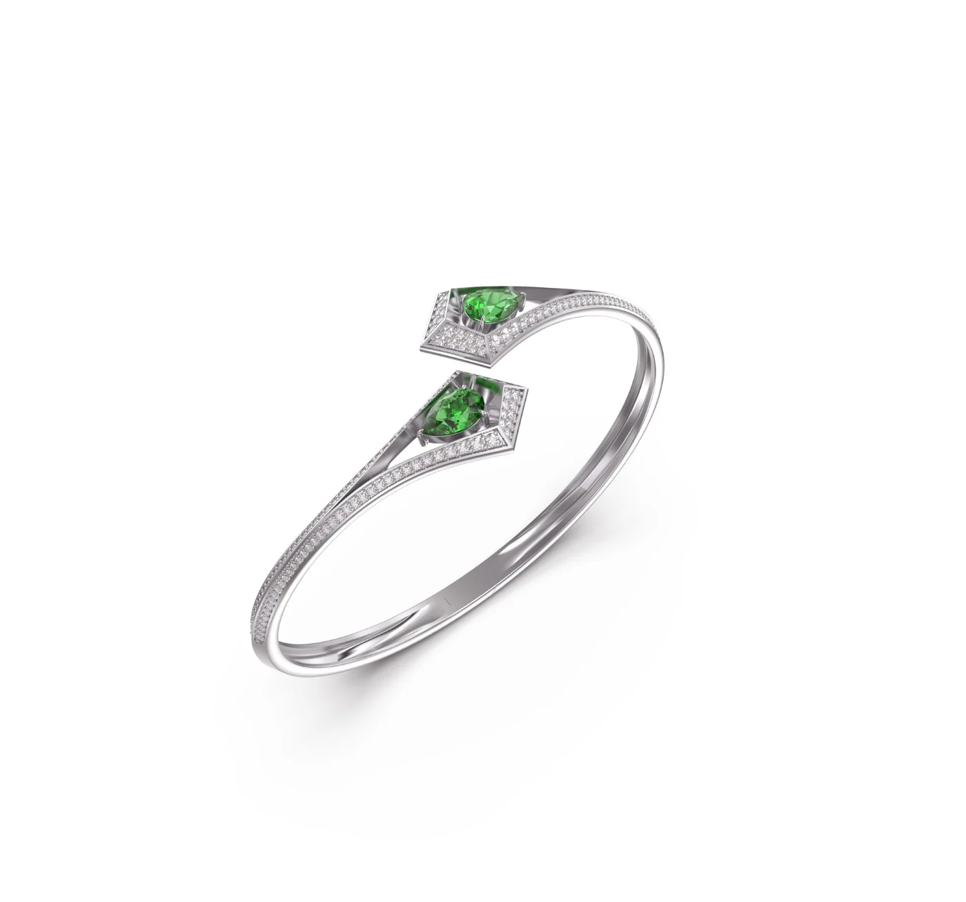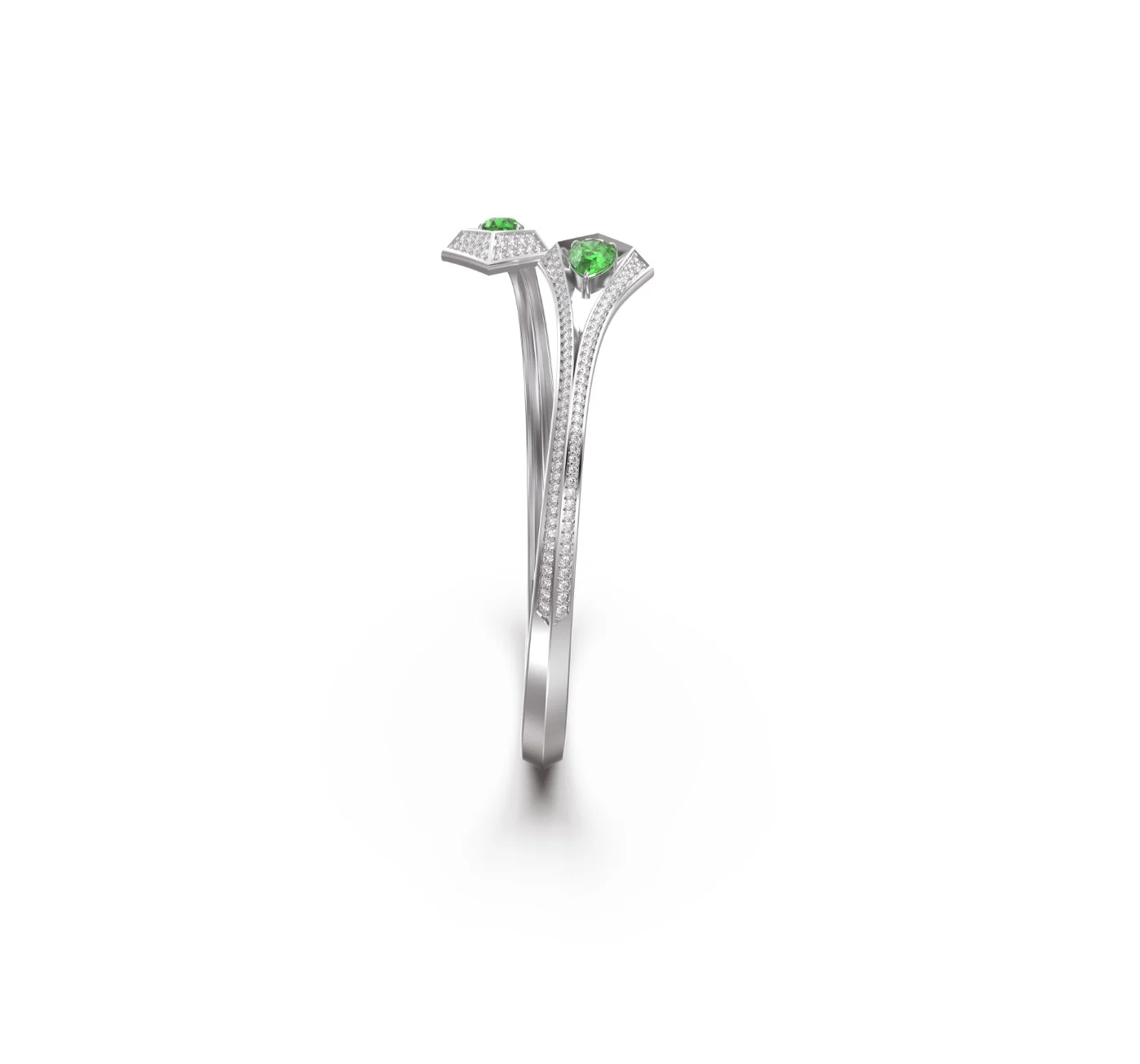 Crafted in 18k gold, the open geometric form is crowned on each end with a radiant emerald, framed by a precise halo of pavé-set diamonds.