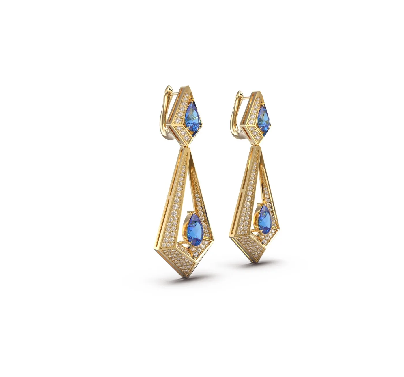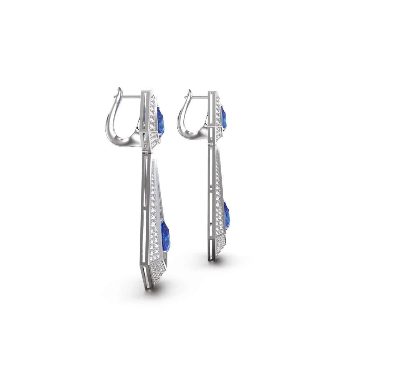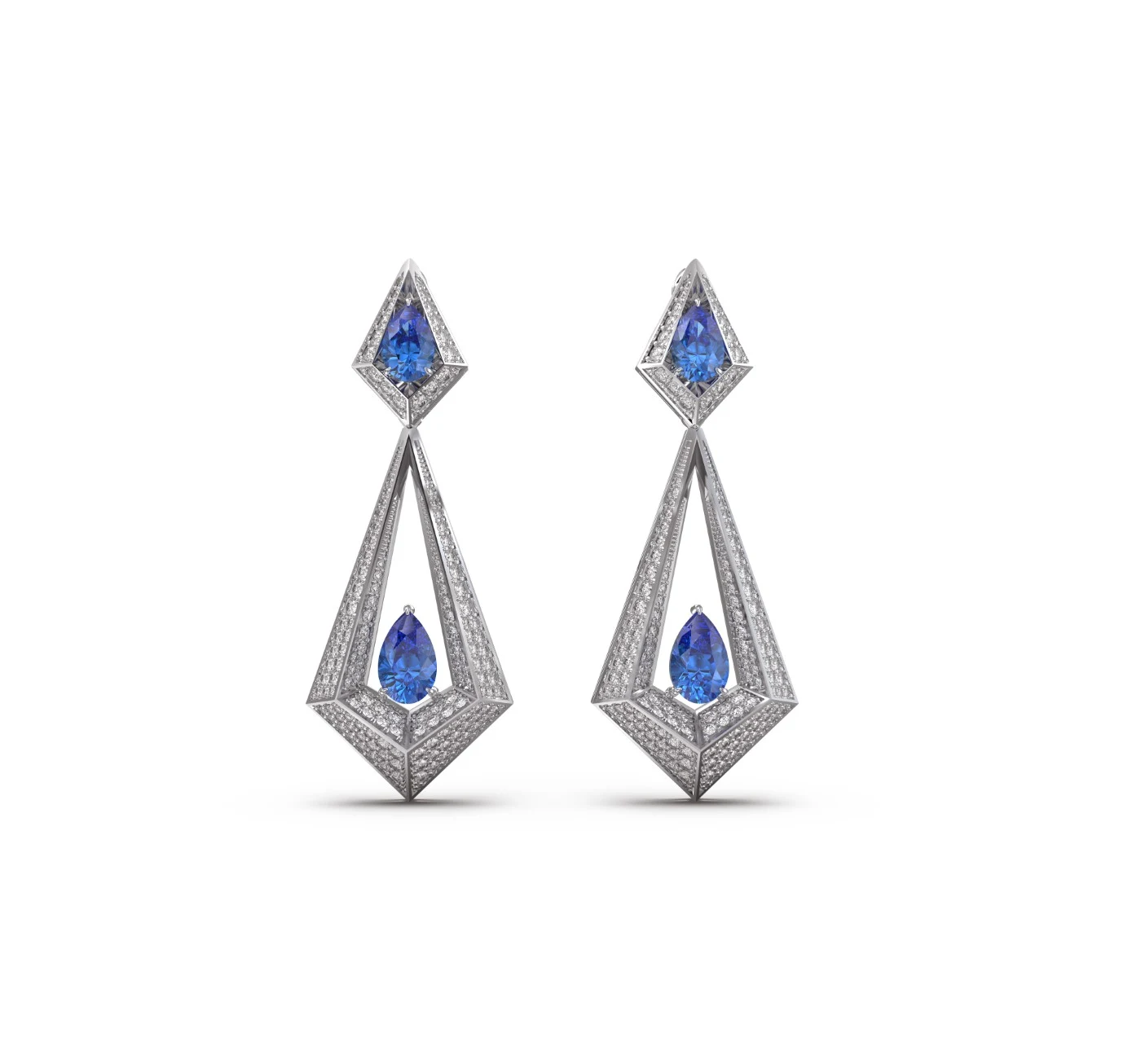 Sculpted from 18k gold, their angular design is set with vivid blue sapphires in pear and marquise cuts, framed by shimmering pavé-set diamonds.