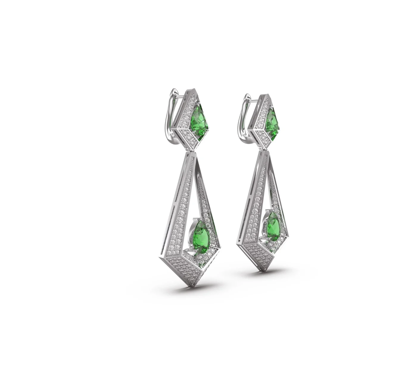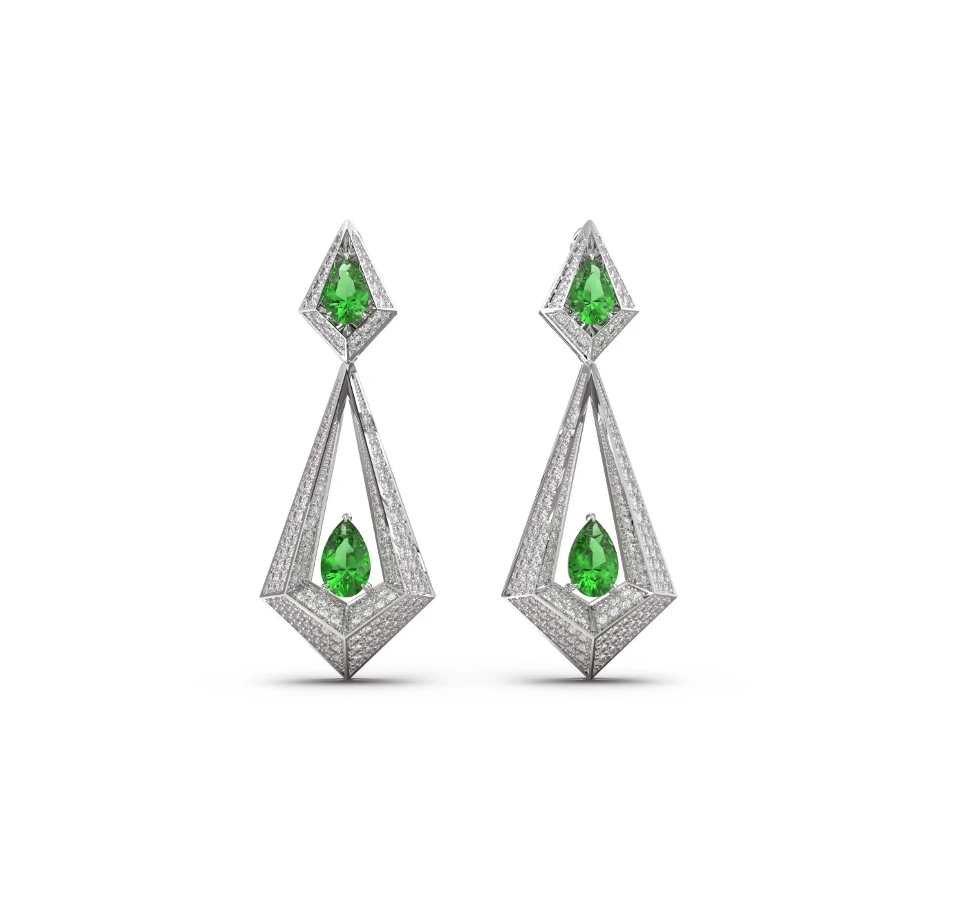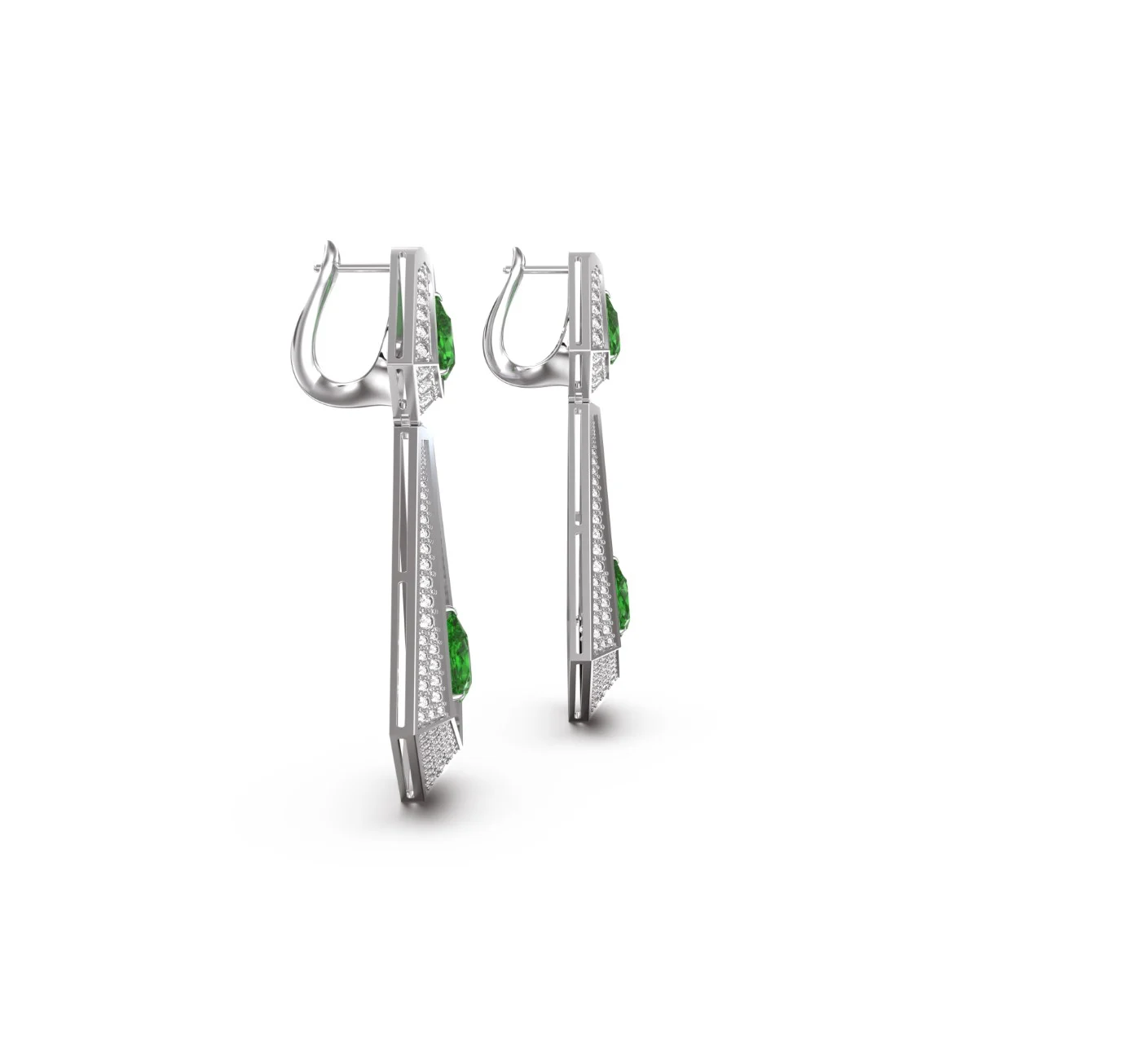 Crafted from 18k gold, their angular openwork design is set with vivid green emeralds framed by delicate pavé-set diamonds, creating a mesmerizing play of light and color.
