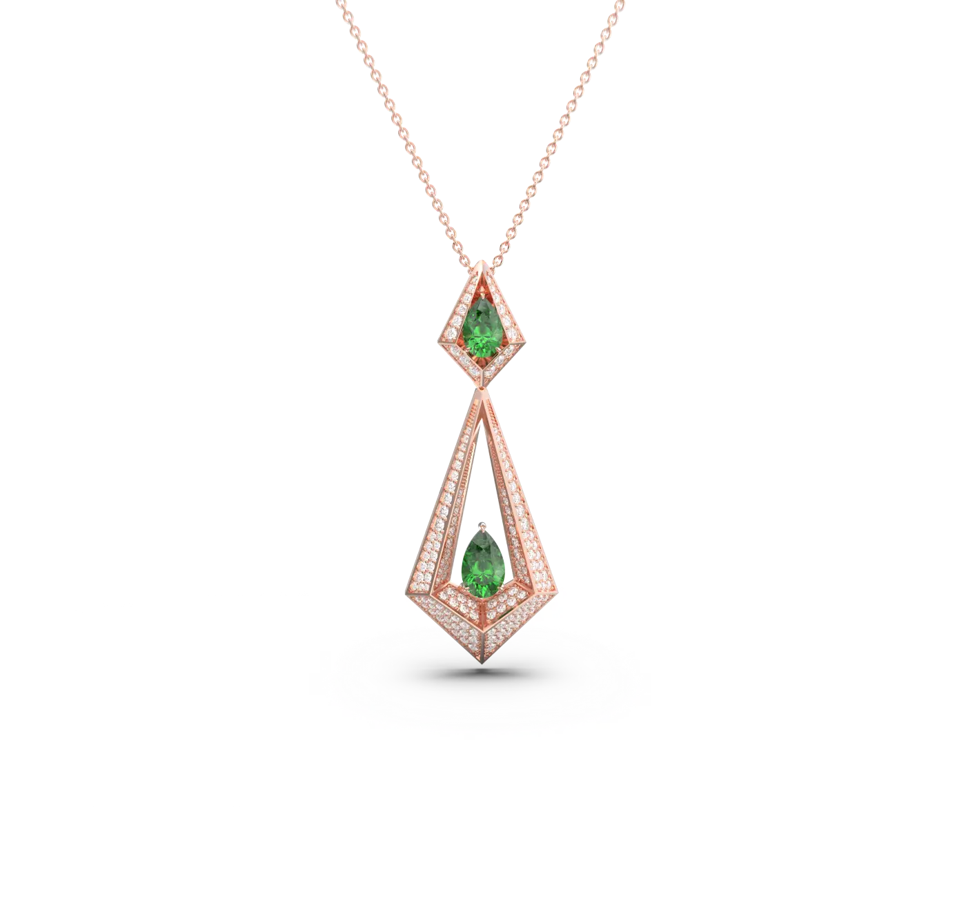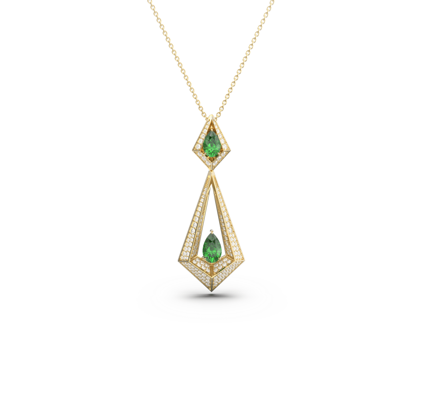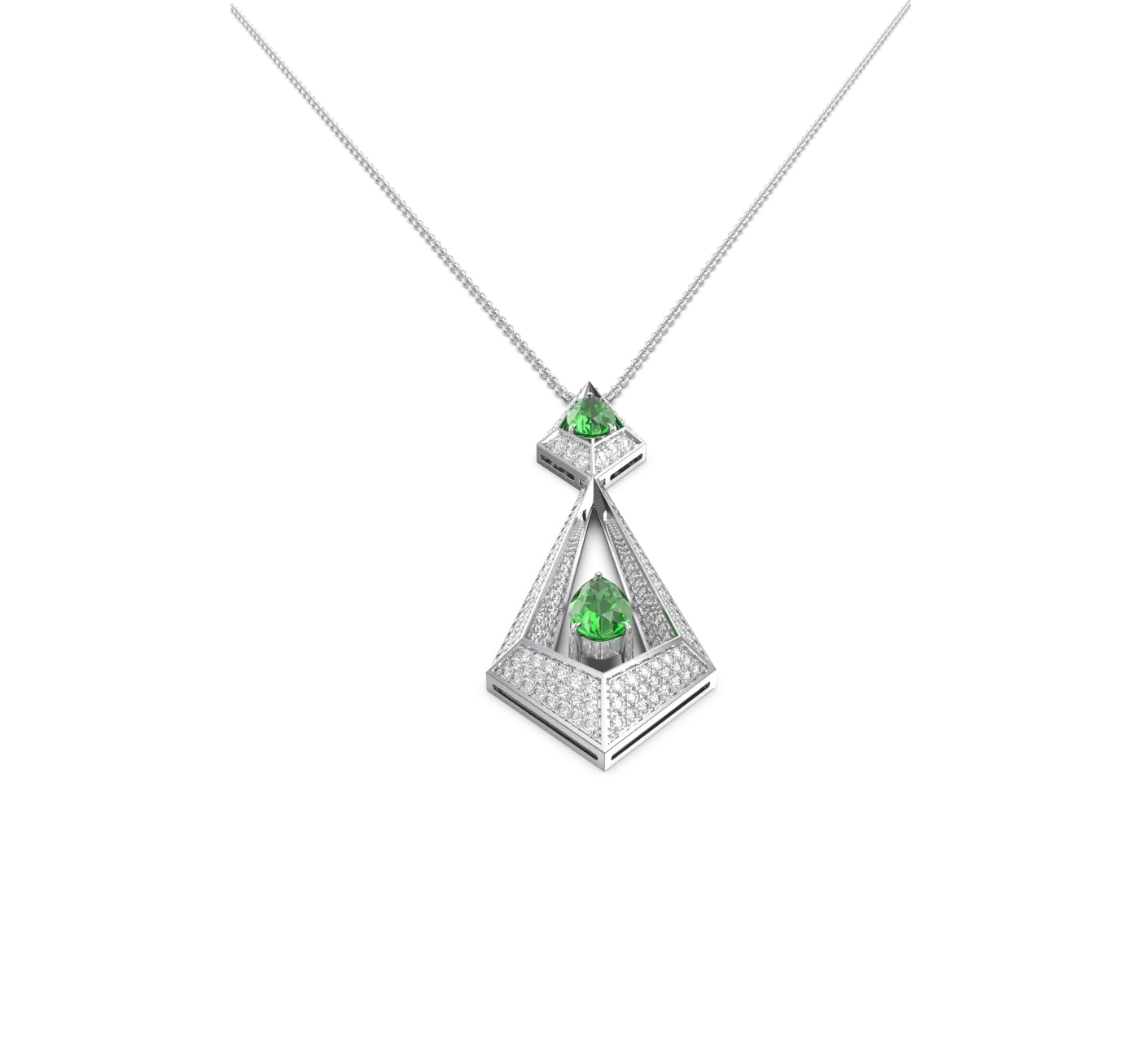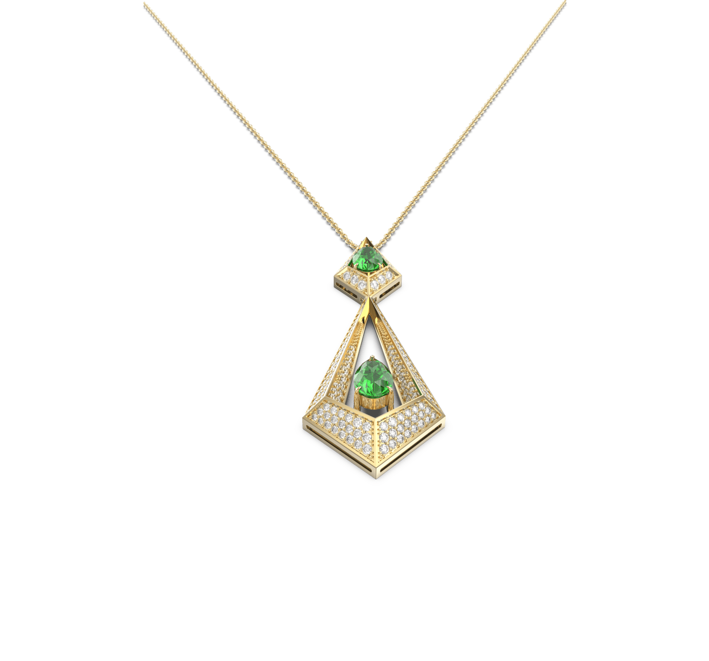 Meticulously crafted from 18k gold, it showcases vibrant emeralds set within a bold triangular frame, accented by a halo of pavé-set diamonds that emphasize depth, light, and symmetry.