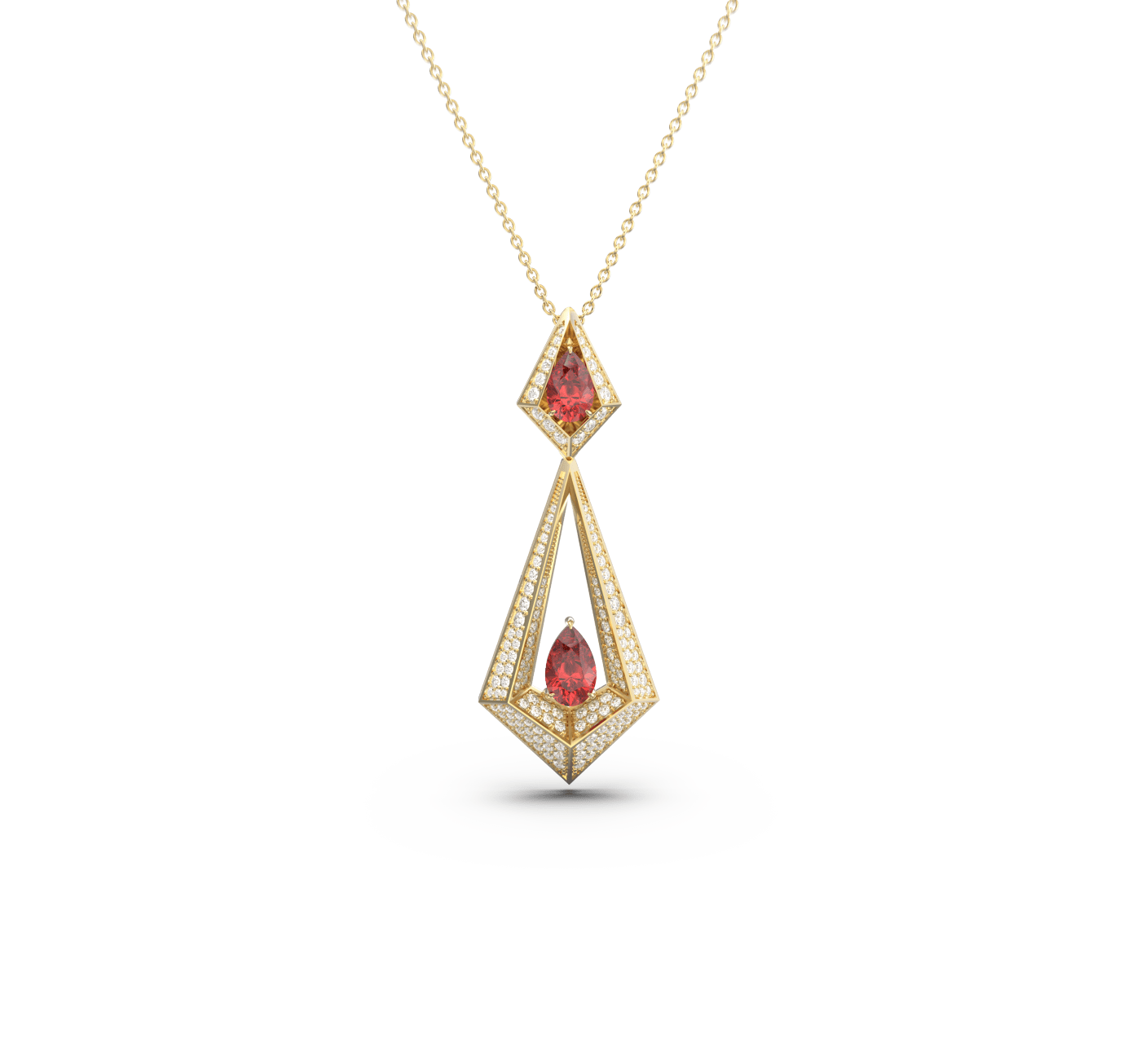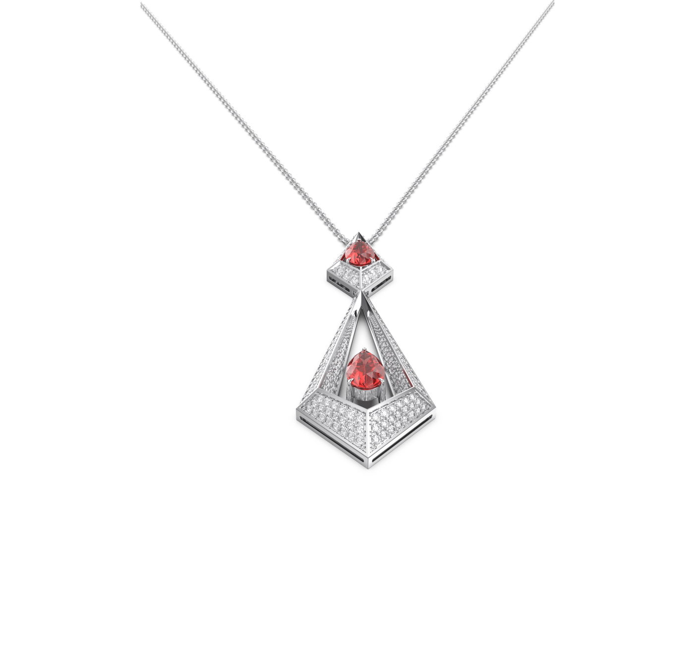 Expertly crafted from 18k gold, it features vivid rubies set within a bold triangular frame — their fiery brilliance amplified by a constellation of pavé-set diamonds that trace each geometric edge.
