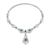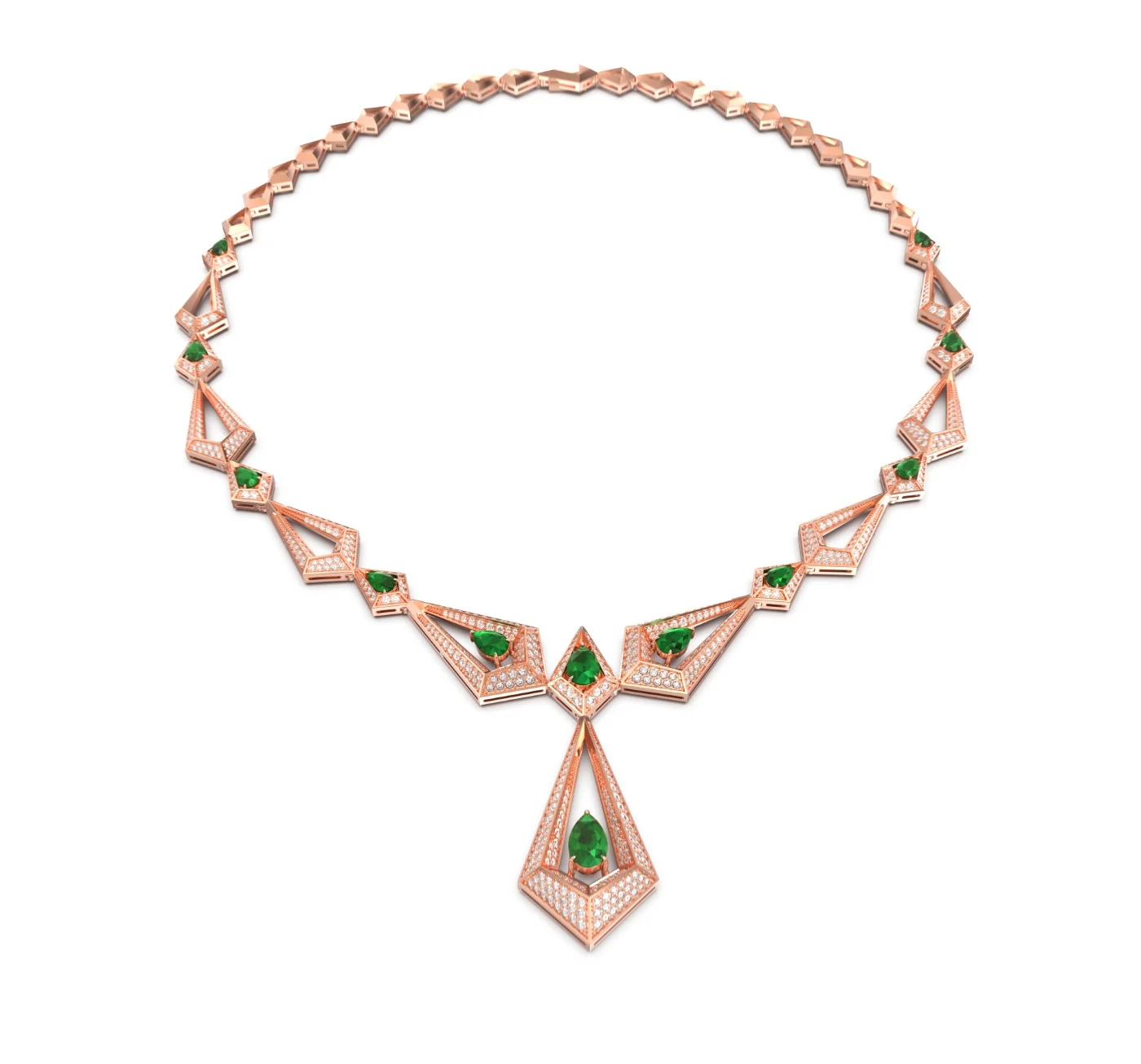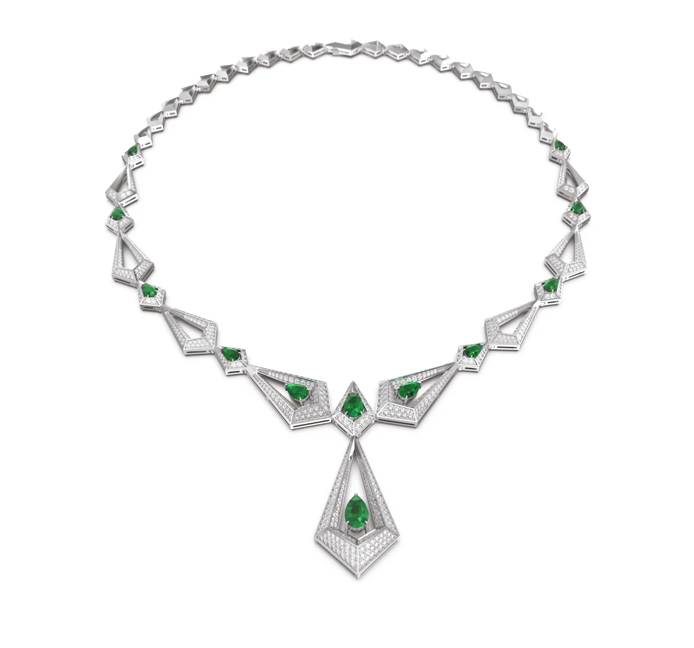 The centerpiece — a sculptural pendant with a suspended emerald — captures the perfect harmony of precision, color, and light.