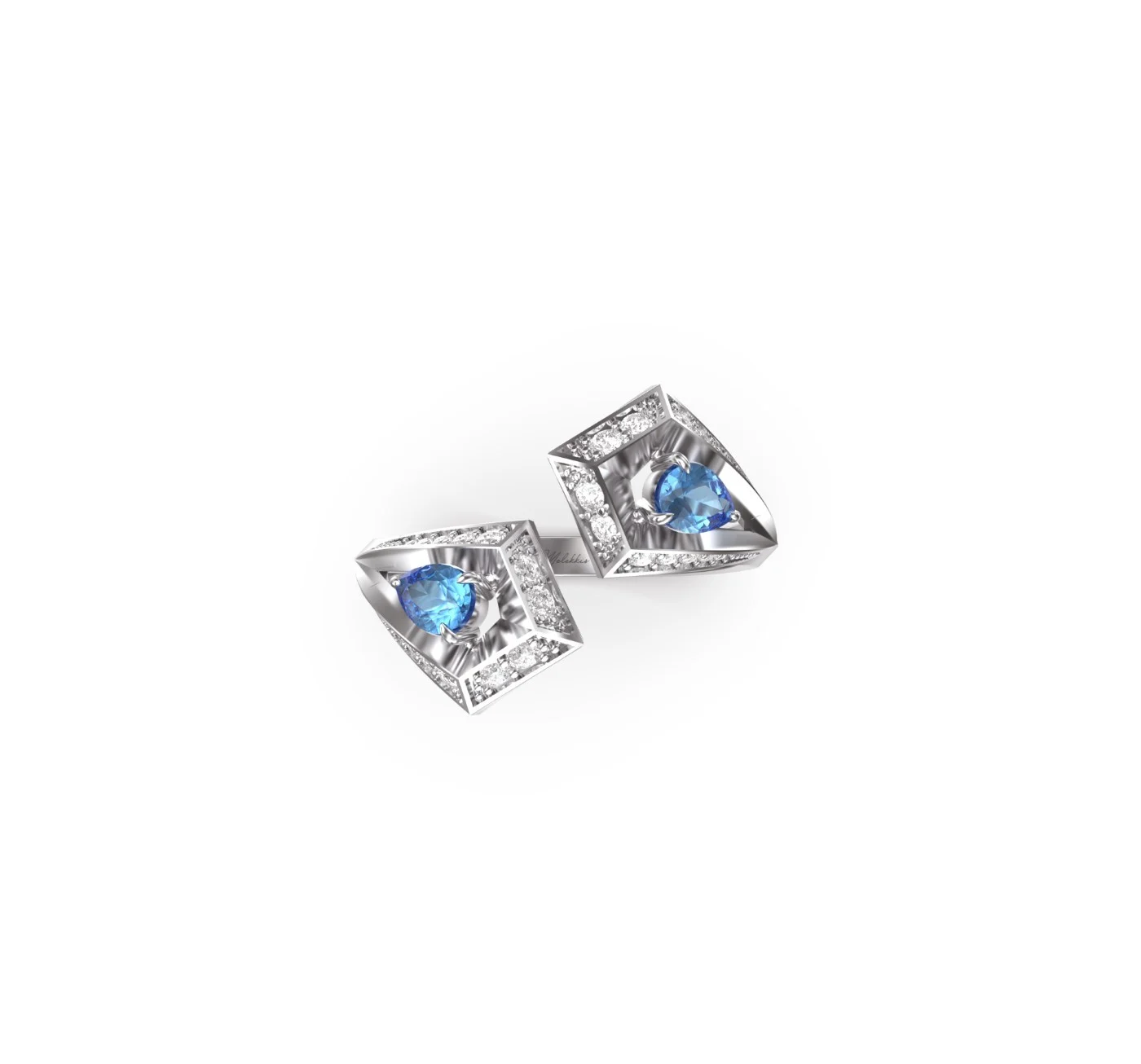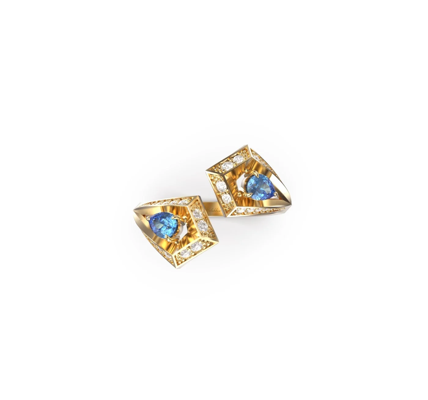 Crafted in 18k gold, the design features two radiant blue sapphires, each framed by a constellation of pavé-set diamonds.