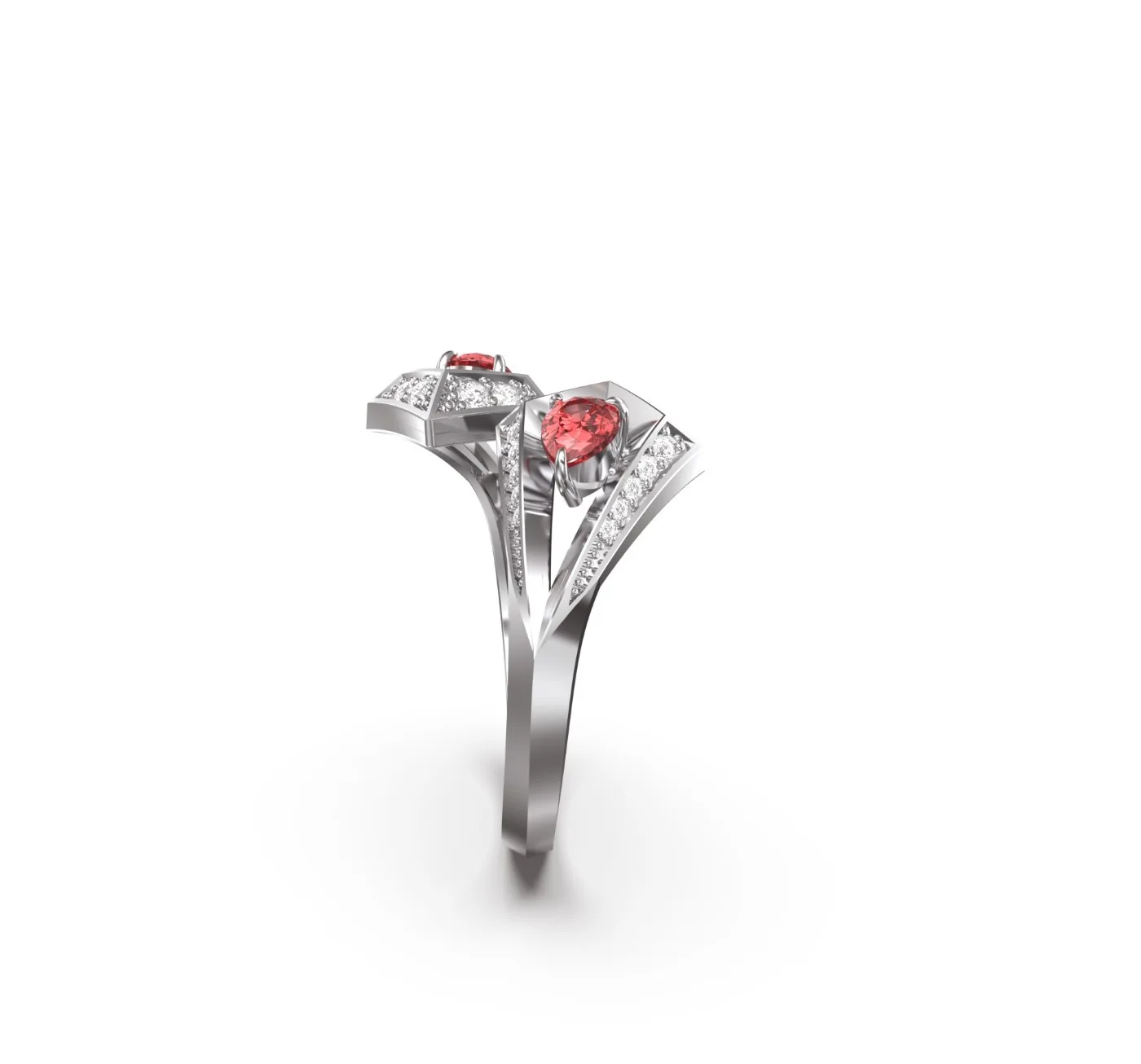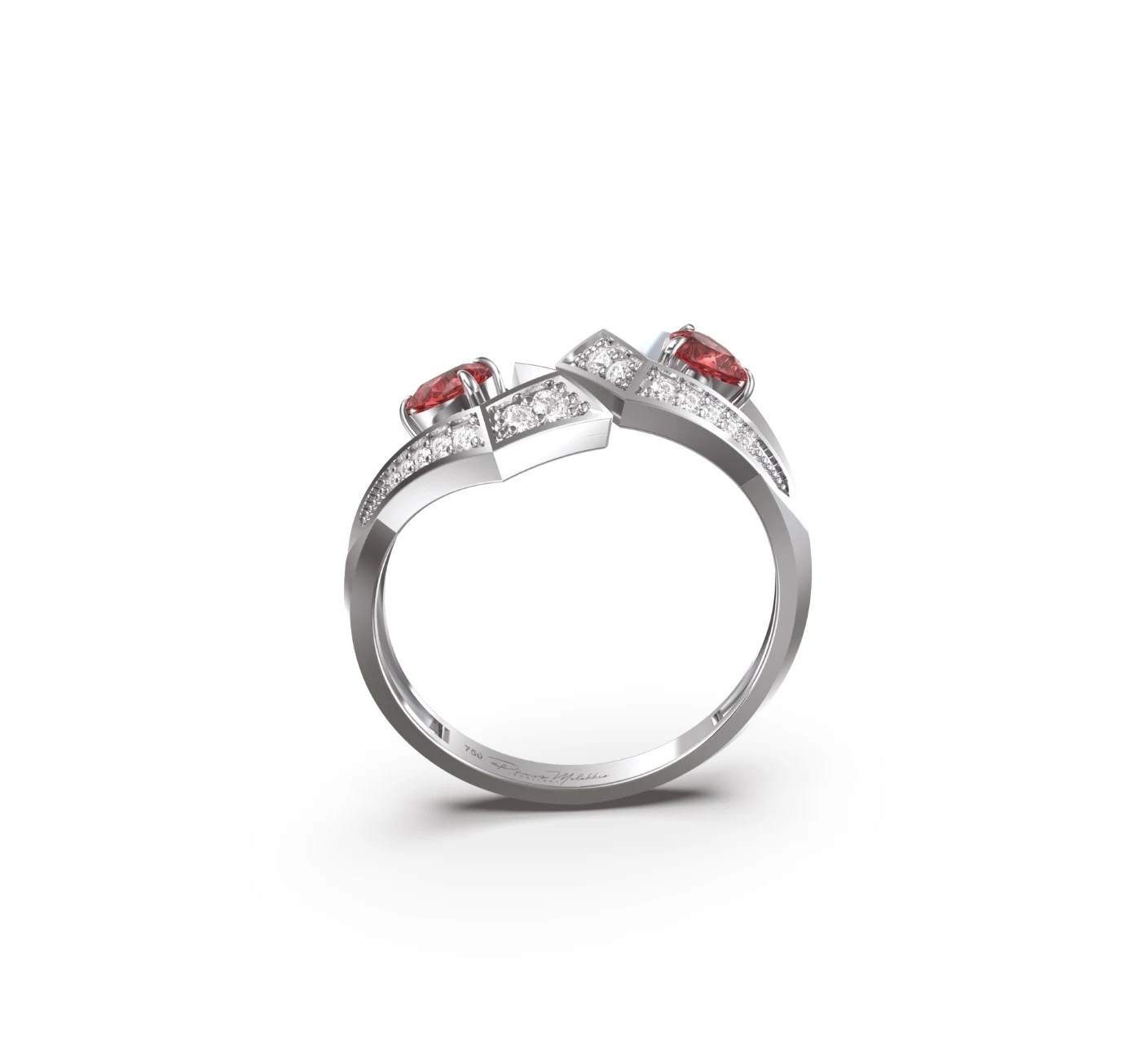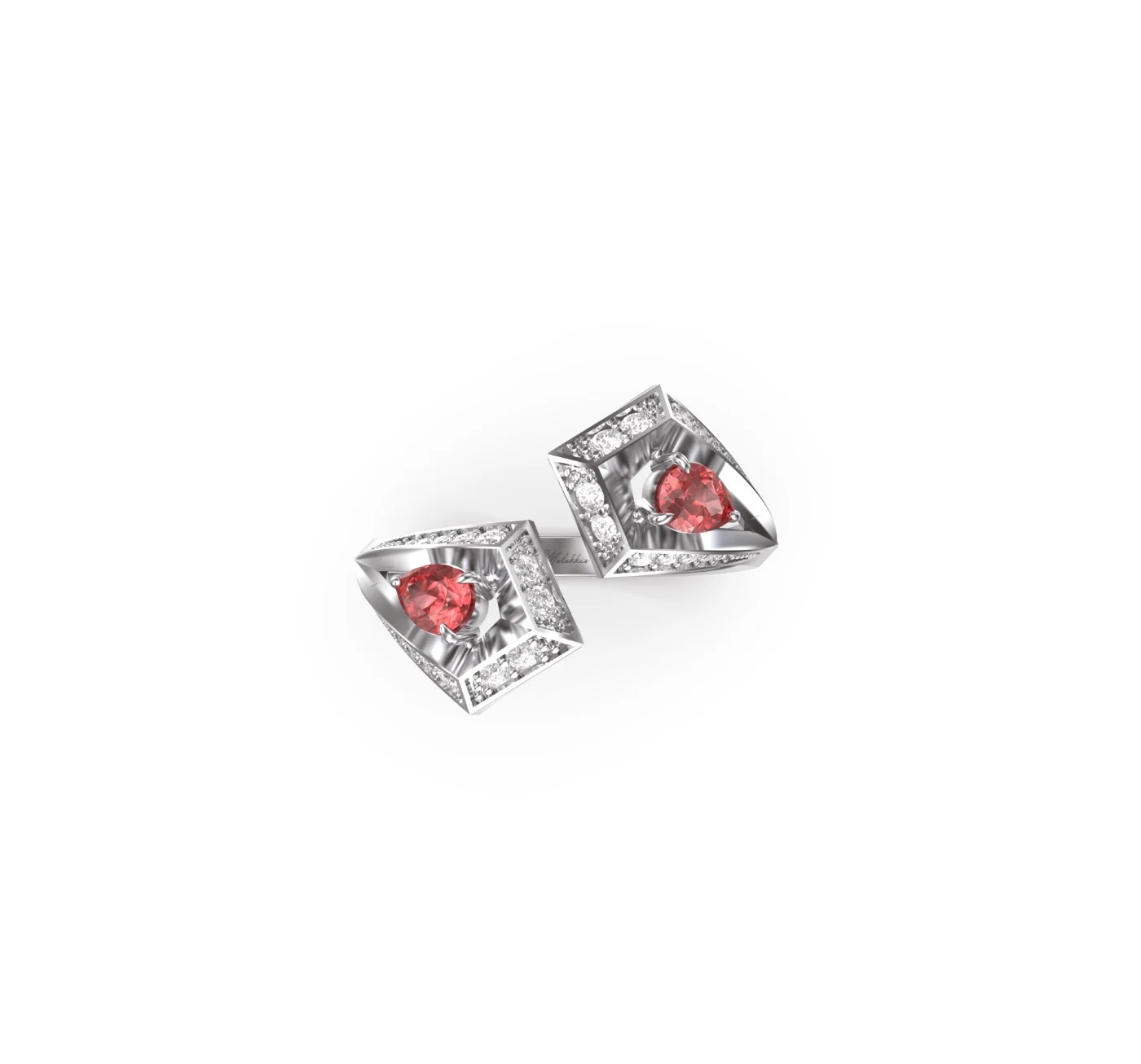 Crafted in 18k gold, the open geometric form is set with two fiery rubies, highlighted by brilliant pavé diamonds for a mesmerizing contrast.